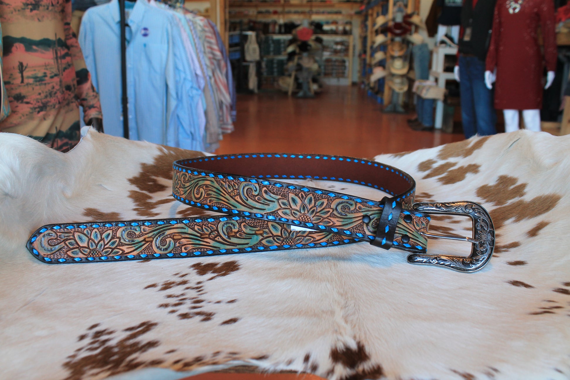 Add a touch of western flair to your wardrobe with the Angel Ranch Western Belt. Made of genuine hand tooled leather with a beautiful floral pattern and blue diamond lacing, this belt is a stylish accessory that will elevate any outfit. The antique silver finish buckle adds a touch of elegance. Available in sizes S-XL.