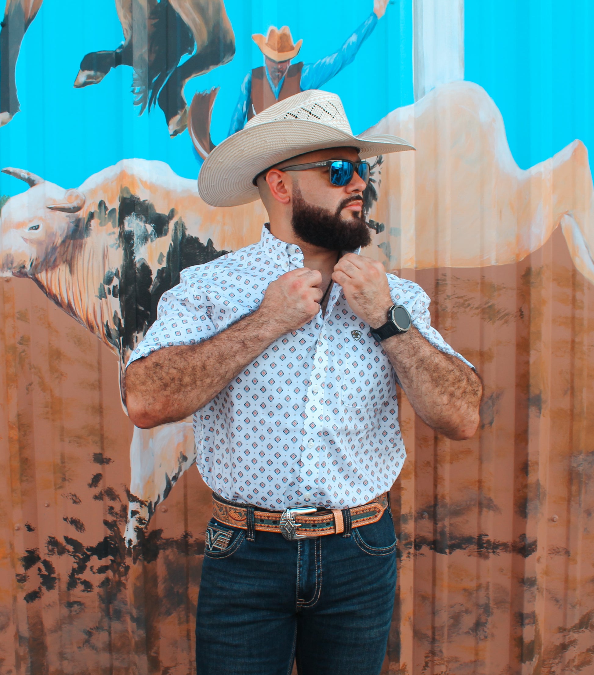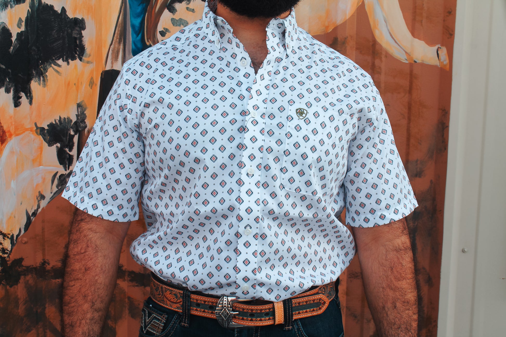 Experience comfort and style with Ariat Men’s Wrinkle Free Evan White SS. This top features a white base color accented with red, grey, and black pyramids for a modern look. With wrinkle-free fabric and a front pocket, this button-up offers both convenience and fashion. Perfect for any197318415760