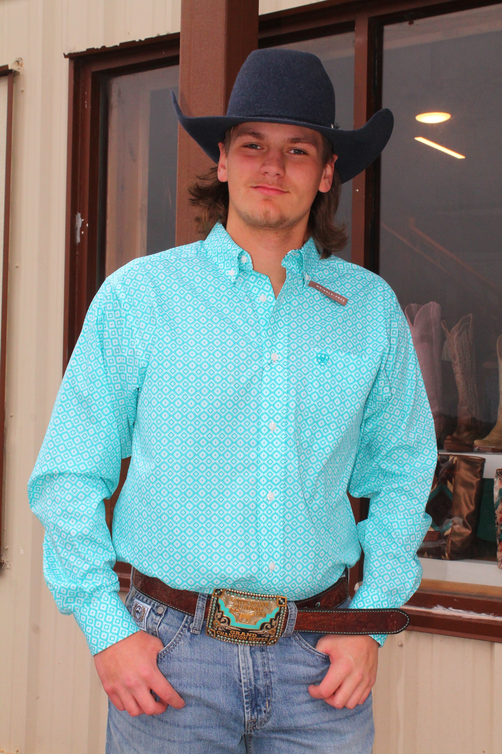 Introducing the Ariat-Stanley LS Shirt! Designed with a classic fit and wrinkle-free material in a stunning peacock blue color, this shirt allows for greater arm mobility, making it the perfect choice for both professional and casual occasions. Look and feel confident with this expertly crafted shirt.
