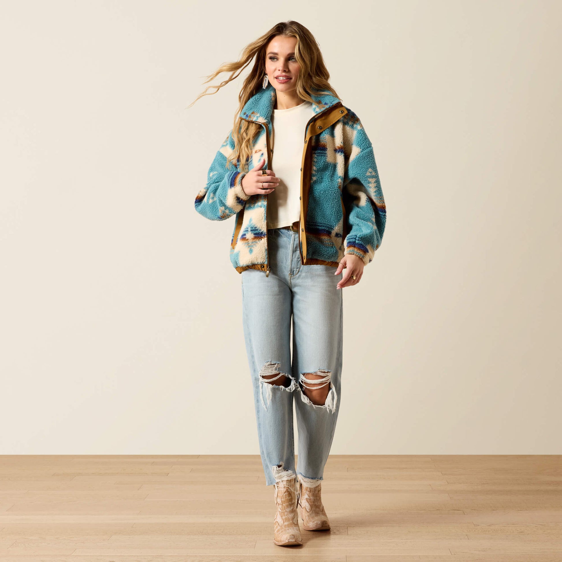 Warm and fuzzy all over, this sherpa jacket brings the cozy to morning chores, afternoon errands, and nights around the bonfire. You don't have to sacrifice style either, thanks to the cropped, oversized fit and Southwestern motif.