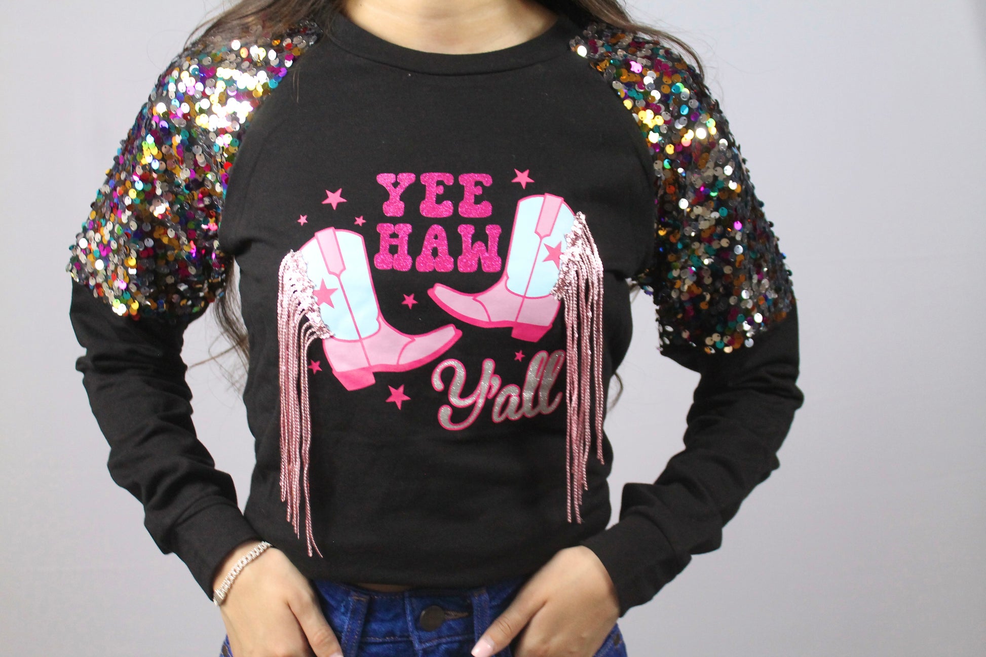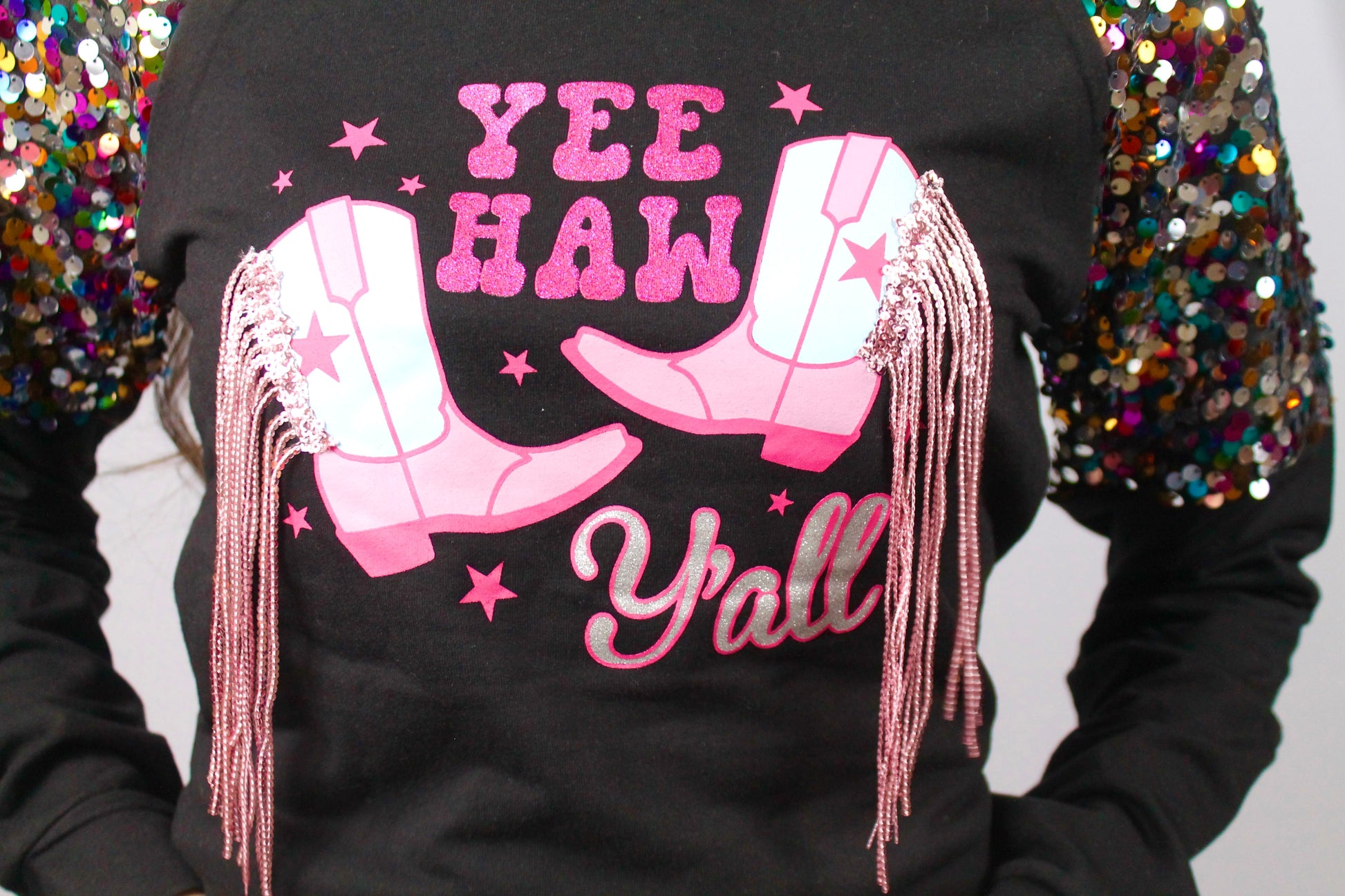 Elevate your western fashion game with our Black Boots Graphic Sweatshirt! Featuring chic sequin shoulders and a bold "yee haw, y’all" and boots with fringe graphic, this sweatshirt is perfect for making a statement. Stay effortlessly stylish and comfortable in this must-have piece.