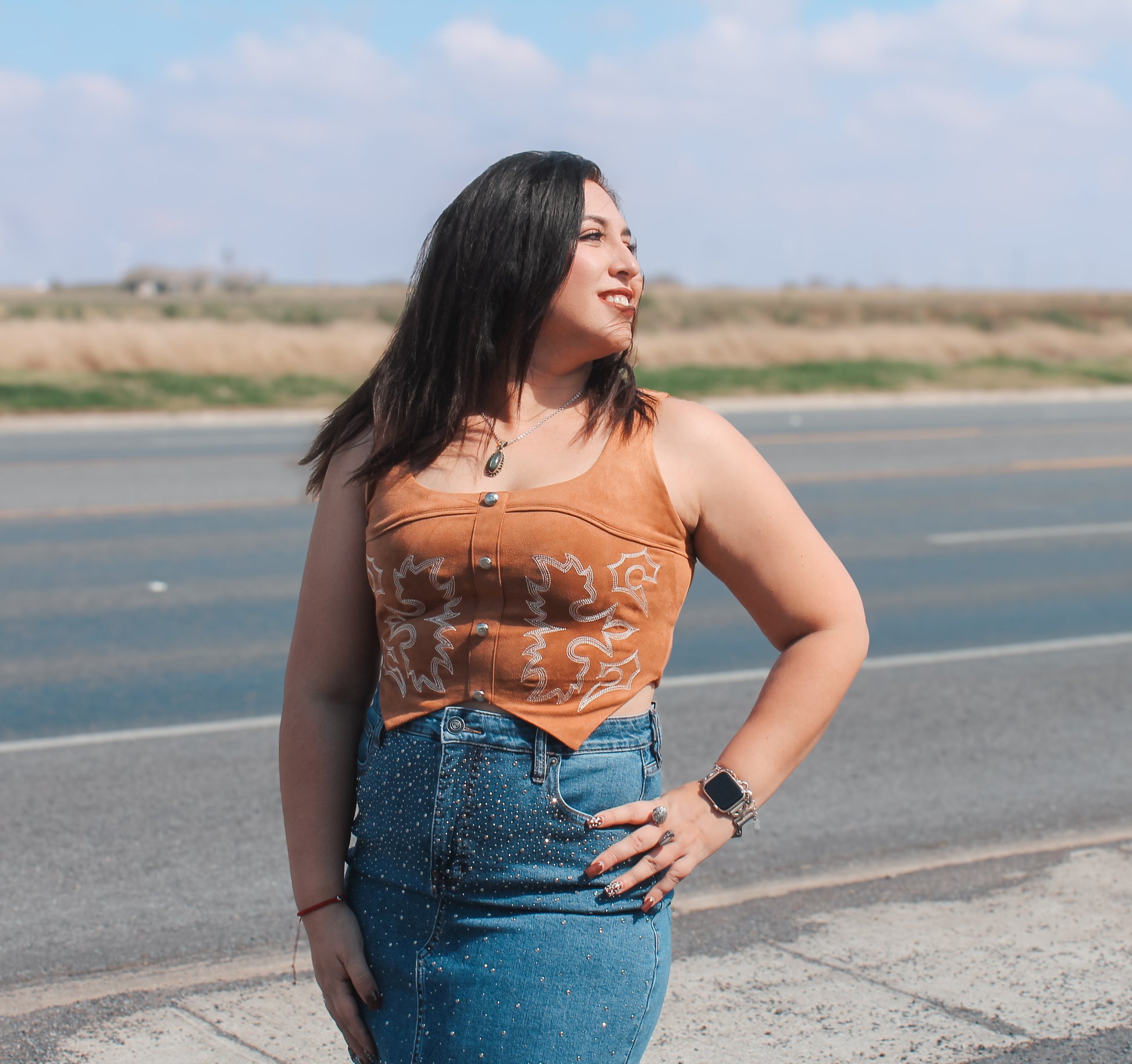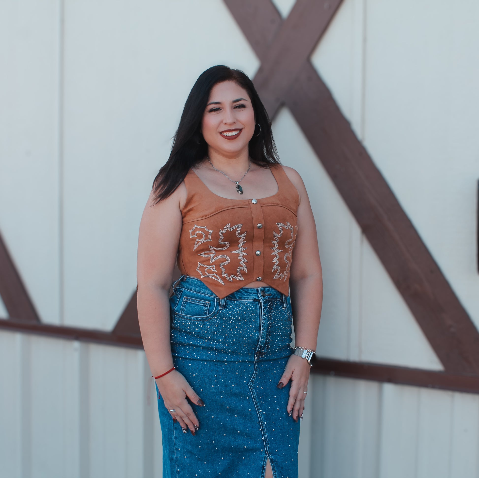 Elevate your look with our Buck Stitch Babe Corset Top. Crafted in camel suede with boot stitch embroidery, this top features concho buttons for added flair. Perfect for a stylish and unique statement.