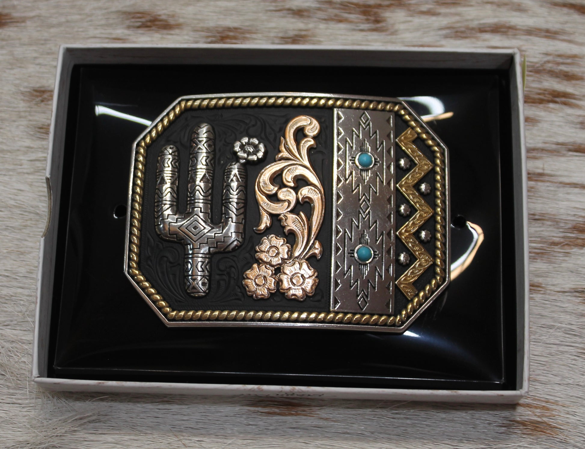 Expertly crafted with a silver base color, this Cactus Alley buckle showcases intricate 3D cactus and flower designs. Add a touch of western charm to any outfit and stand out in style. Made with quality materials, this buckle is sure to last.