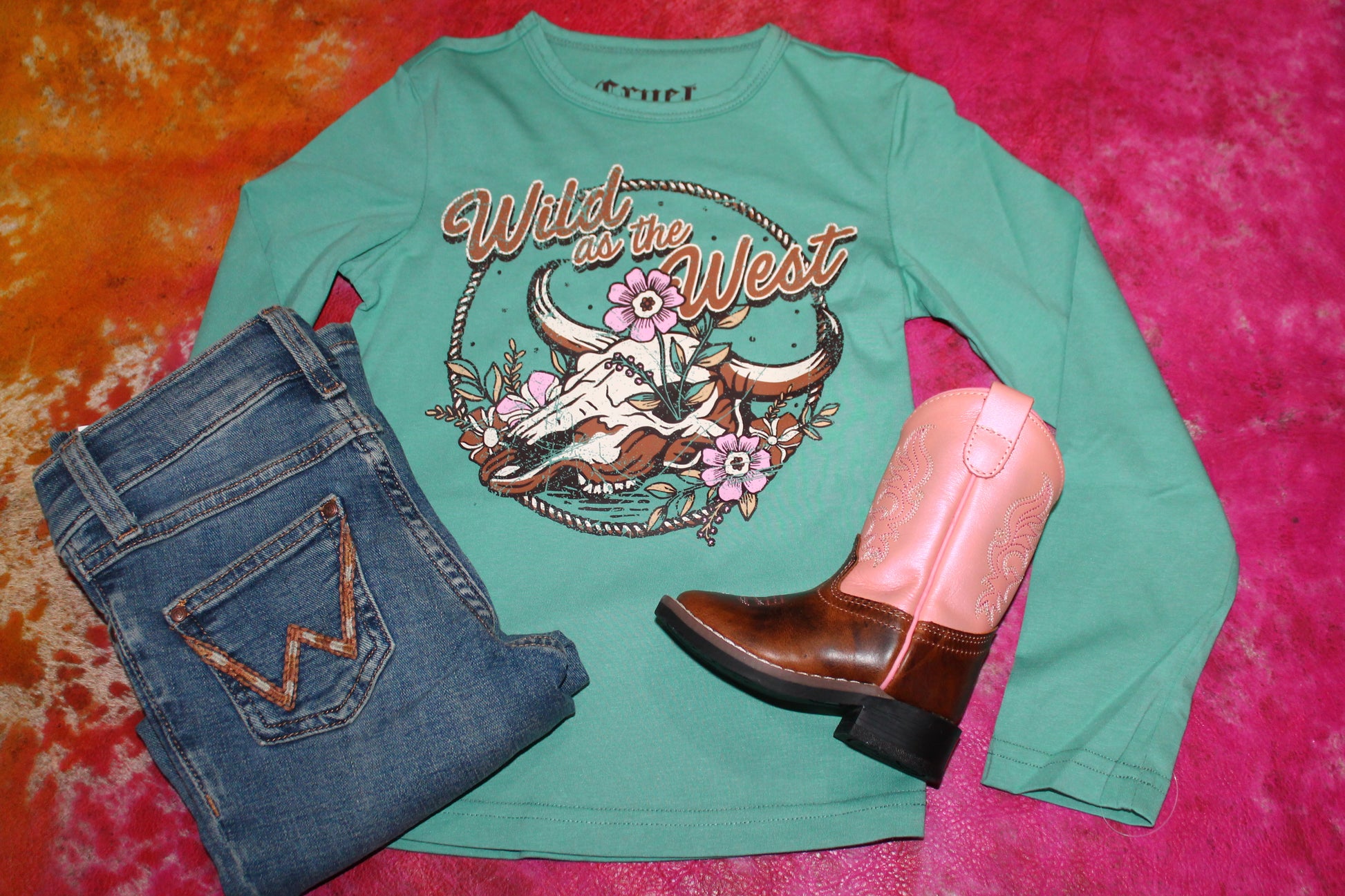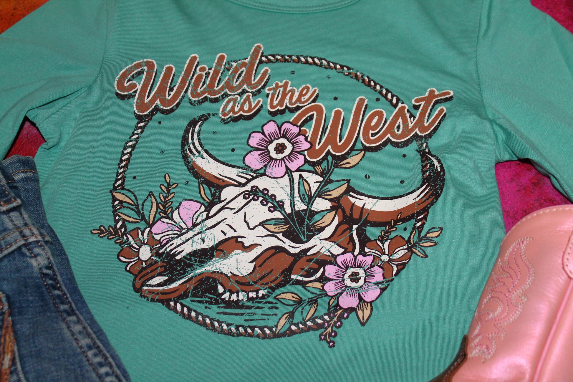The Cinch Wild As The West LS Tee is perfect for young girls who love to stand out. Made with a comfortable blend of 60% cotton and 40% polyester, this long sleeve tee features a vibrant turquoise color and a unique Wild as the West bull skull with flowers graphic. A must-have for any young country girl.