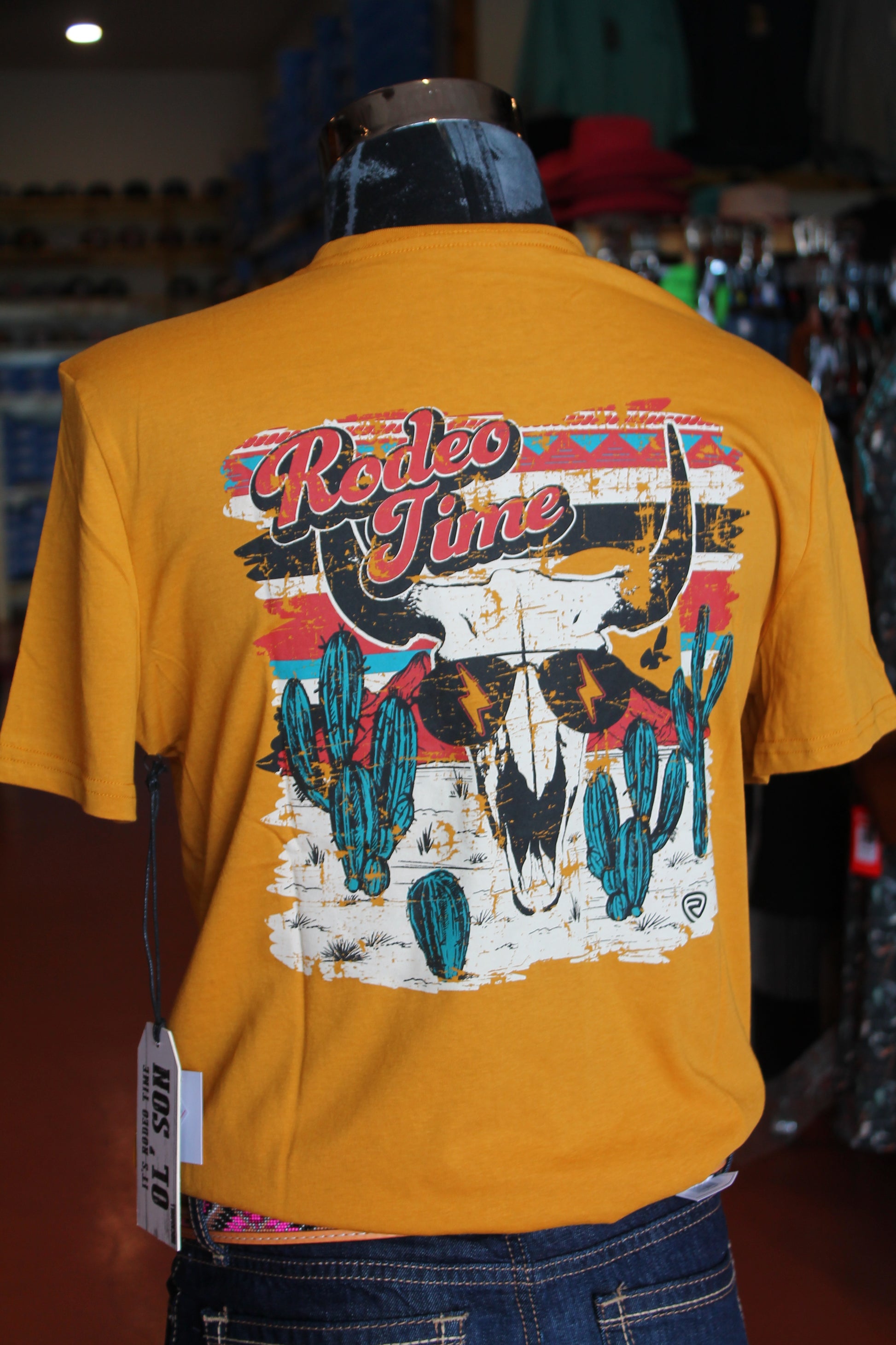 Discover the perfect balance of western style and comfort with our Dale Graphic Skull Tee in gold. Part of the Dale Brisby collection, this unisex tee features a bold desert bull skull graphic on the back and a small pocket on the front. Perfect for rodeo time or everyday wear. Available in adult sizes.