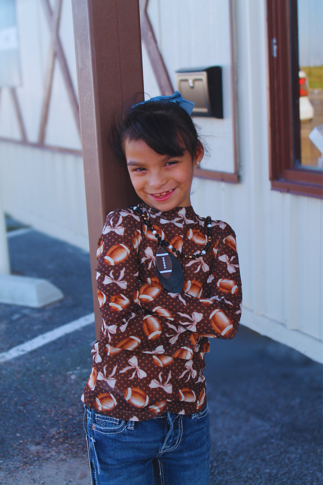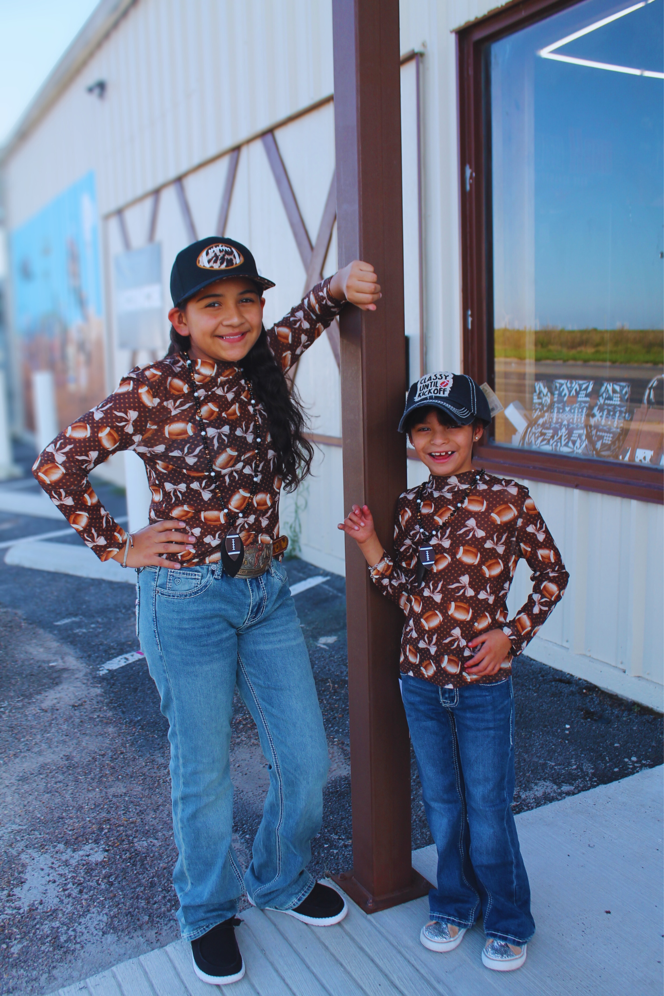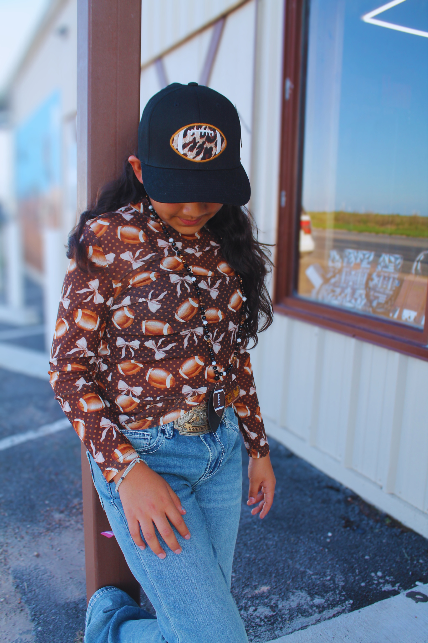 Stay comfortable and stylish during game day with our Game Day Vibes Mesh Top (Youth)! Featuring a dark brown mesh design adorned with light brown polka dots and a fun football and ribbon print, this long sleeve top is perfect for any young fan. Made with high-quality materials for maximum breathability and durability.