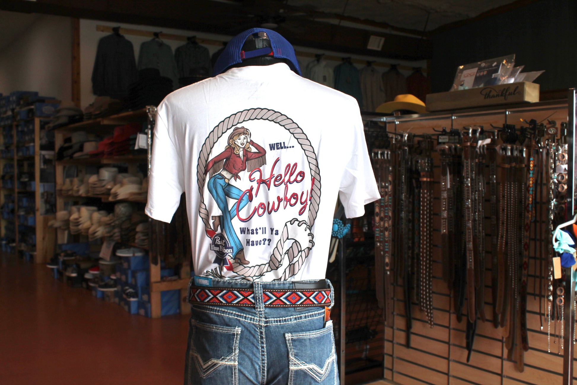 Get ready to wrangle with the Hooey Pabst Blue Ribbon Tee. This comfortable blend of 50% cotton and 50% polyester features original artwork and the iconic Pabst Blue Ribbon logo on the pocket and "Hello Cowboy" graphic on the back. Upgrade your cowboy style with this authentic and unique tee.