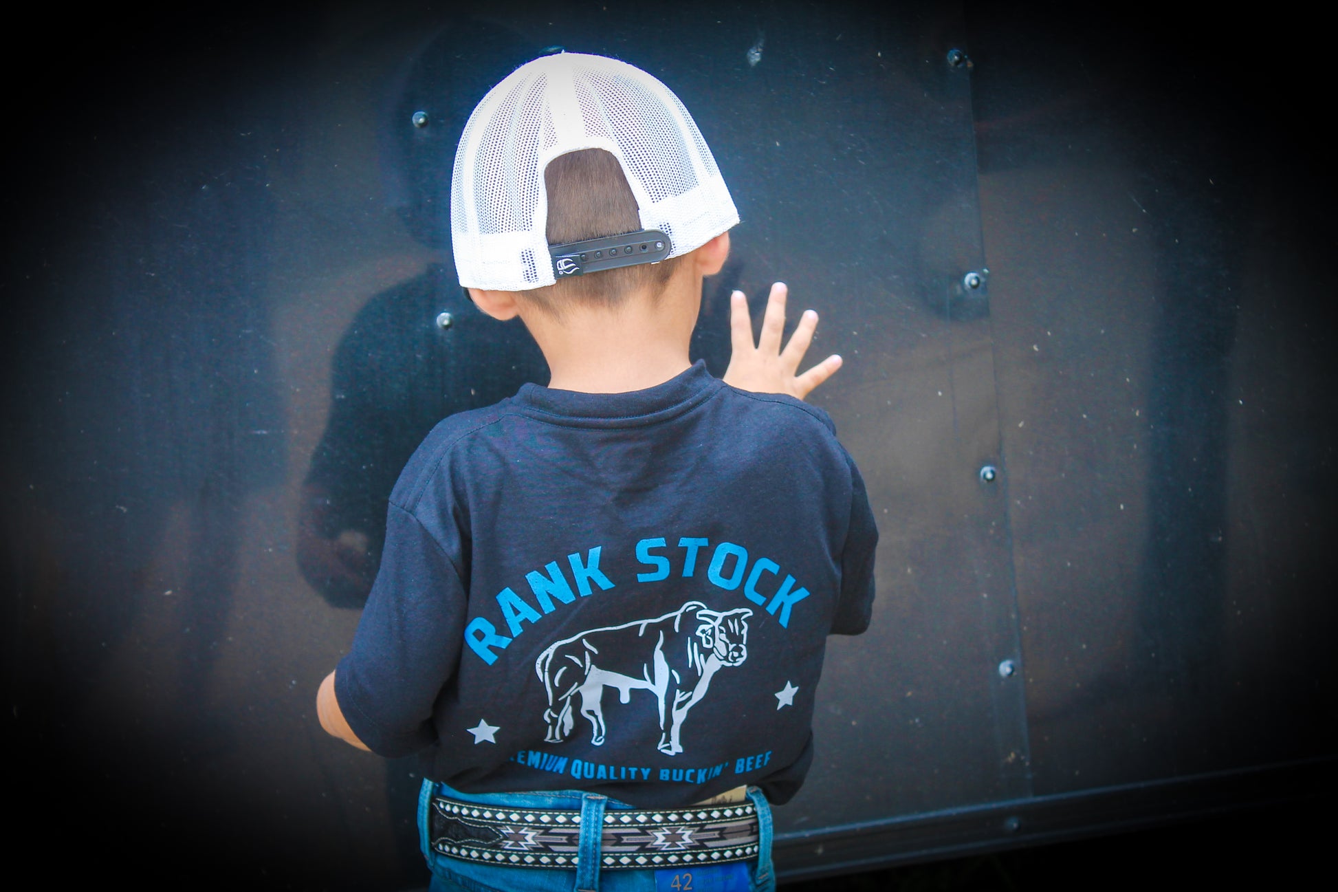 Introducing the Hooey Youth Charbray Black Tee - a premium blend of 50% cotton and 50% polyester for ultimate comfort and durability. Featuring a sleek black design with a bold "Rank Stock" logo on the back and front pocket, this T-shirt is perfect for any young trendsetter. Upgrade their wardrobe today.