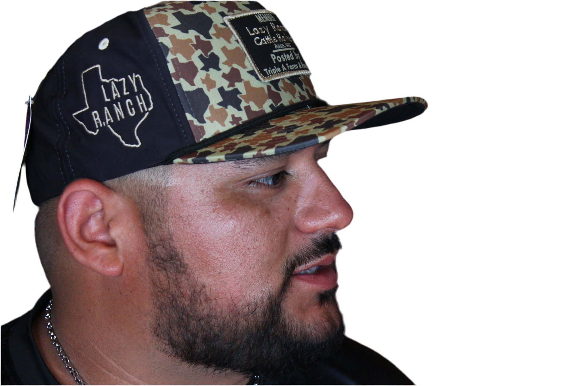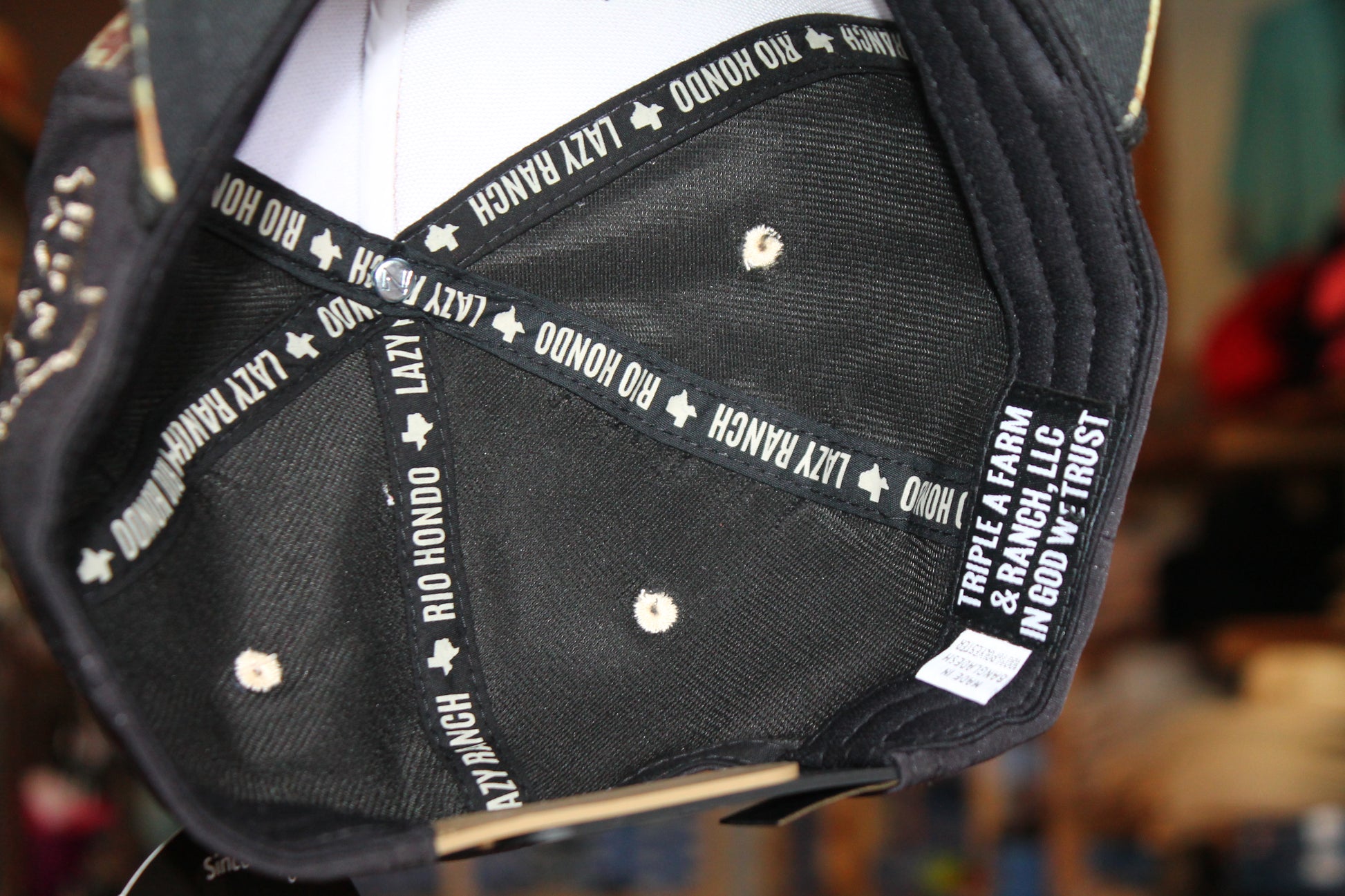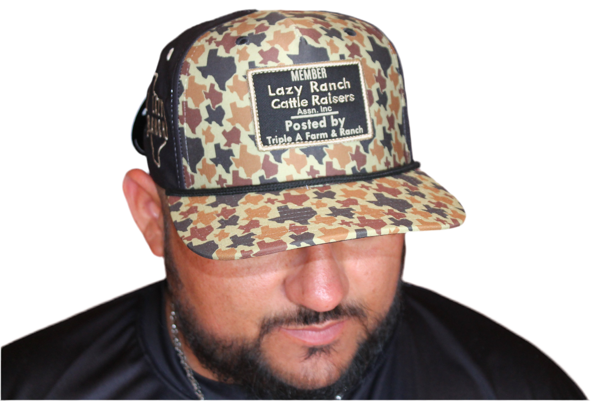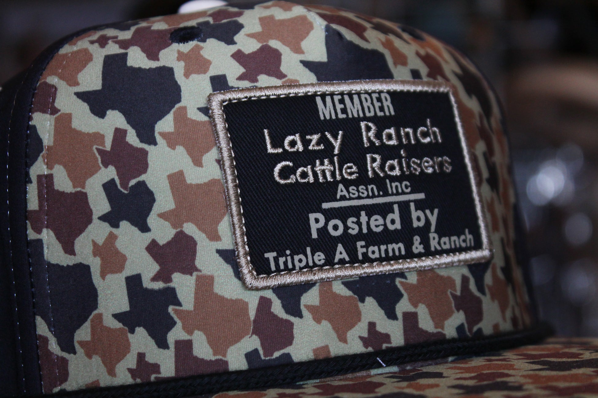 Own the ranch lifestyle with Lazy Ranch Cattle Raisers- Camo. This camo Texas design includes a member patch, posted by Triple A Farm & Ranch. The black rope and Texas embroidery on the side proudly state "lazy ranch", with an "In God We Trust" tag on the inside.
