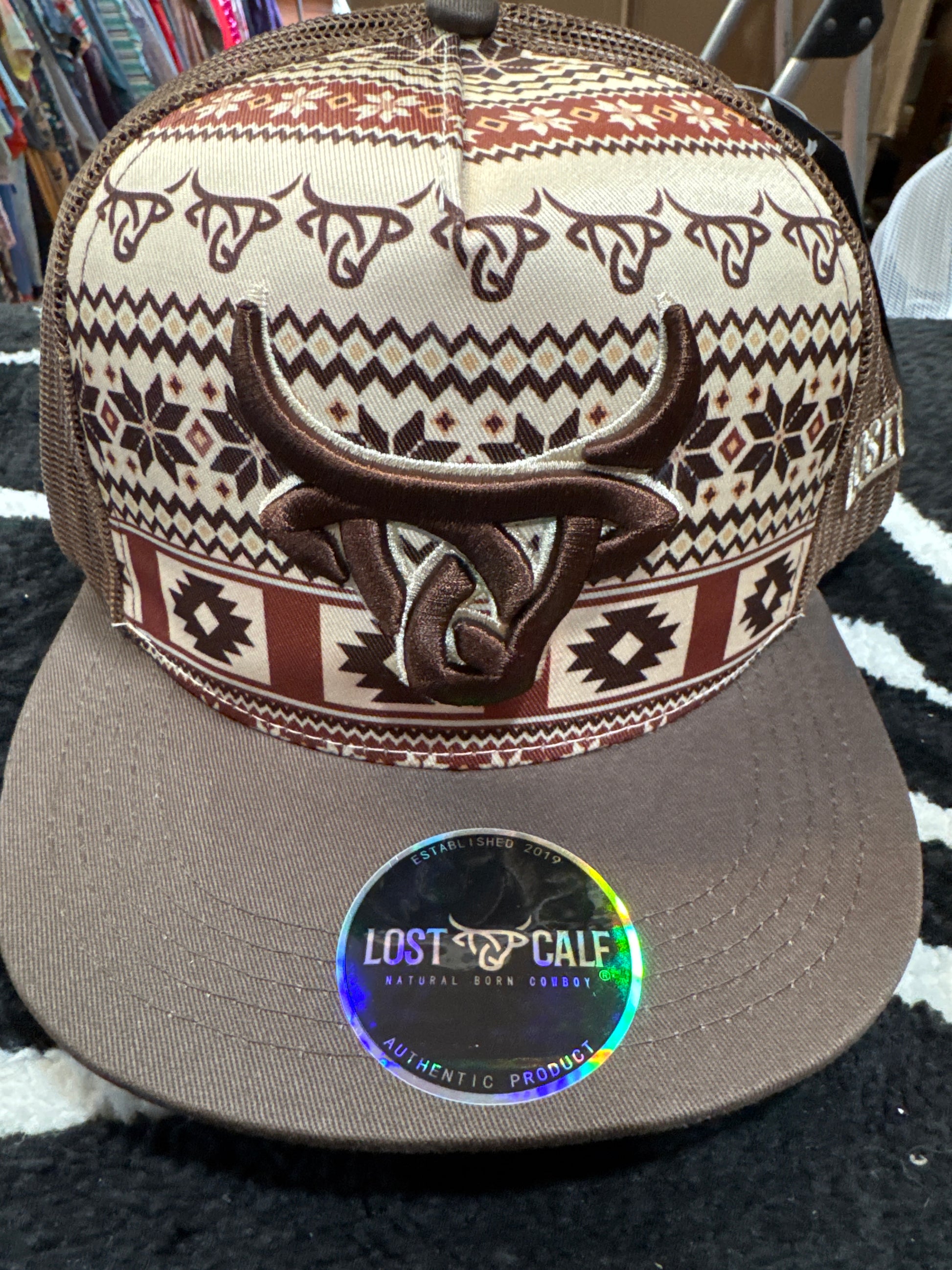 This Lost Calf brown Aztec 🧢 features a unique and eye-catching brown Aztec print in addition to a beautifully embroidered calf skull design. Made with high-quality materials, this hat is perfect for adding a touch of style to any outfit. Embrace the wild west with this statement accessory.