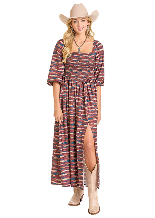 Expertly crafted with a maroon floor length design and elegant slit, this Midi Dress is the perfect addition to your evening wardrobe. The beautiful accents of black, cream, and burnt orange add a touch of sophistication to this stunning piece. Elevate your style with this must-have dress.