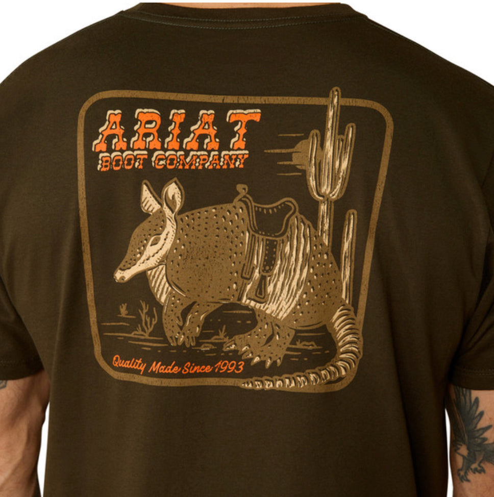 The Men's Ariat Armadillo Tee Shirt is the perfect addition to your wardrobe. Made with a dark green base, this short sleeve tee displays the iconic Ariat orange logo on the side. The back showcases a unique armadillo image, making it a stylish and comfortable choice for any casual occasion.