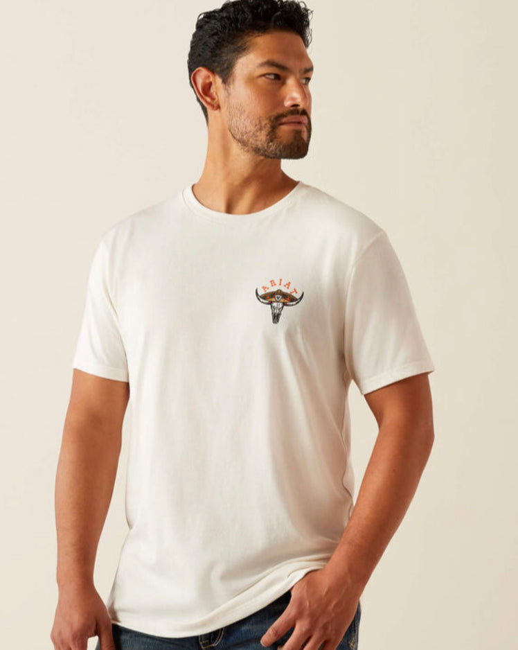 This Men's Ariat Mexicali Tee Shirt is a stylish and comfortable addition to any wardrobe. Crafted with an off white base and featuring a long horn image with an Ariat Mexican hat on the back, this short-sleeved tee is perfect for any casual occasion. Show off your support for the Ariat brand with the small image on the front.