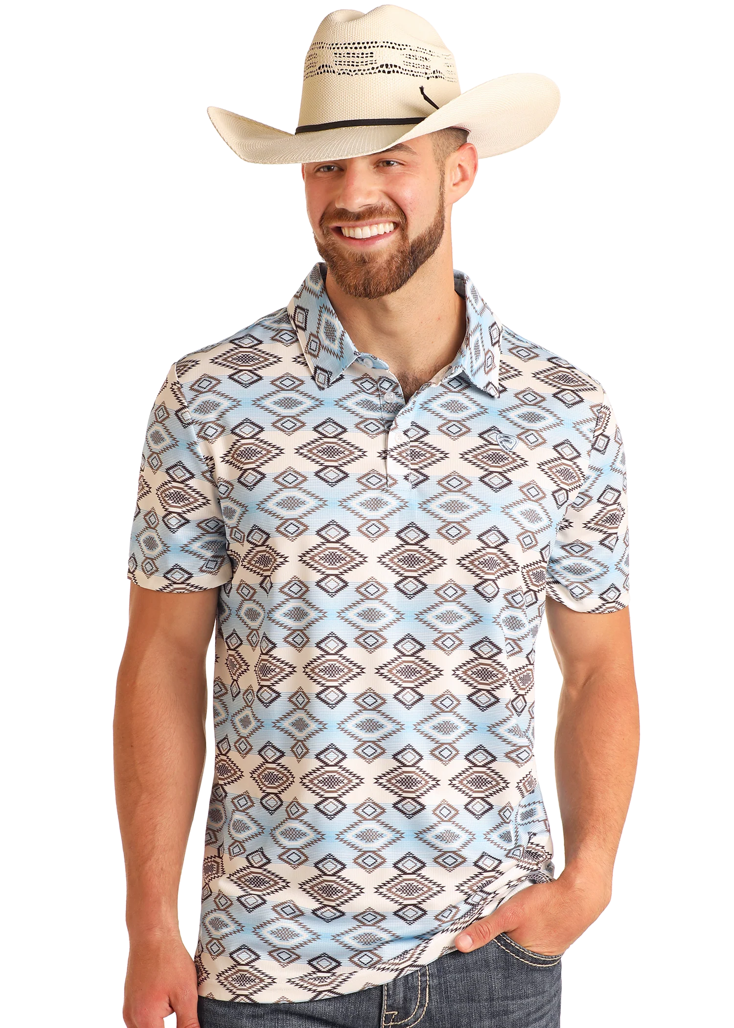 Upgrade your wardrobe with the Men's Rock&Roll White Aztec Polo. Made with 96% polyester and 4% elastane, this polo offers both style and comfort. The spread collar and button-down placket add classic touches, while the unique blue and white striped design with a Southwestern print sets it apart. With the Rock & Roll Denim logo embroidered on the left chest, you'll be making a bold statement without saying a word. Stay comfortable and stylish with this modern twist on a timeless piece.