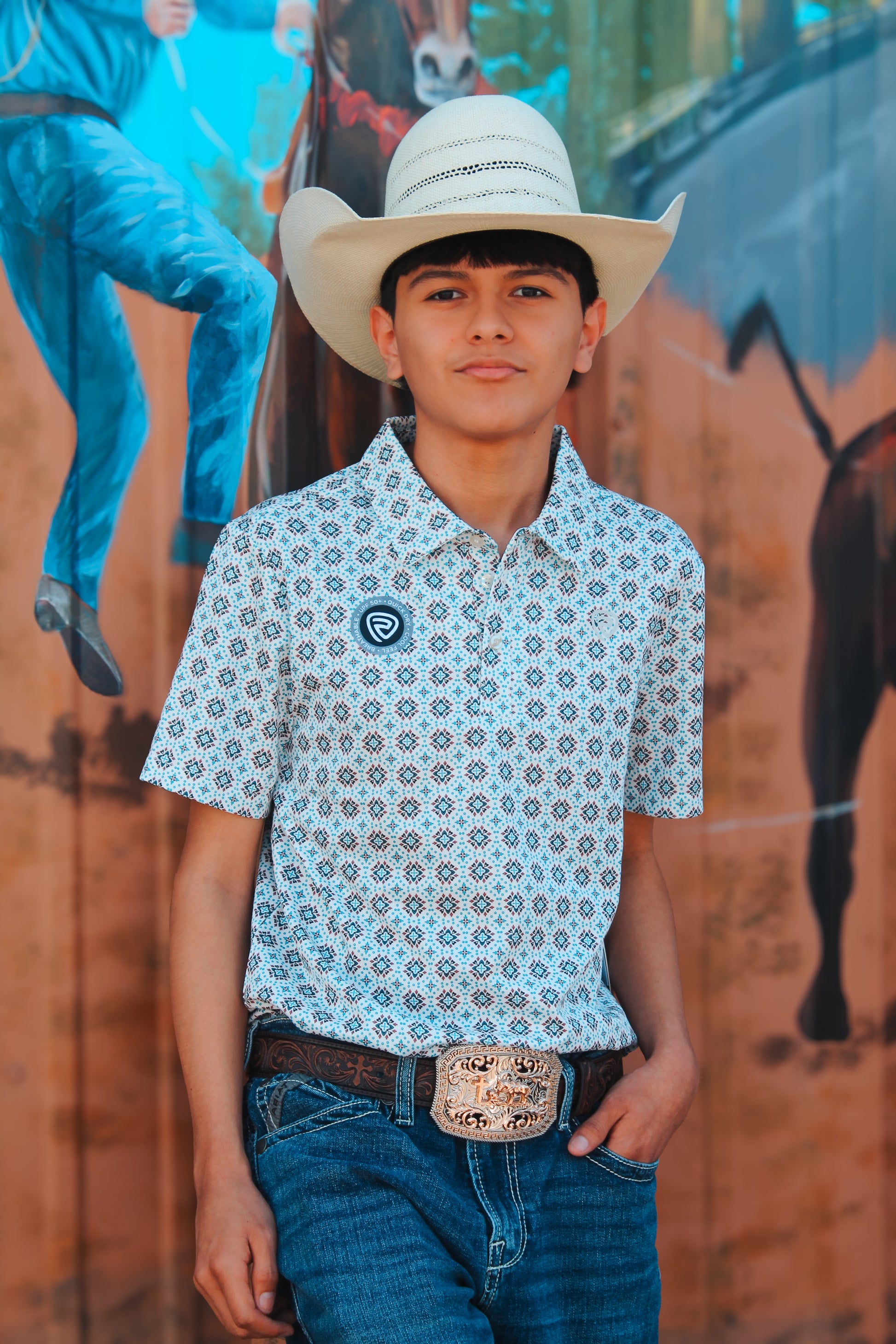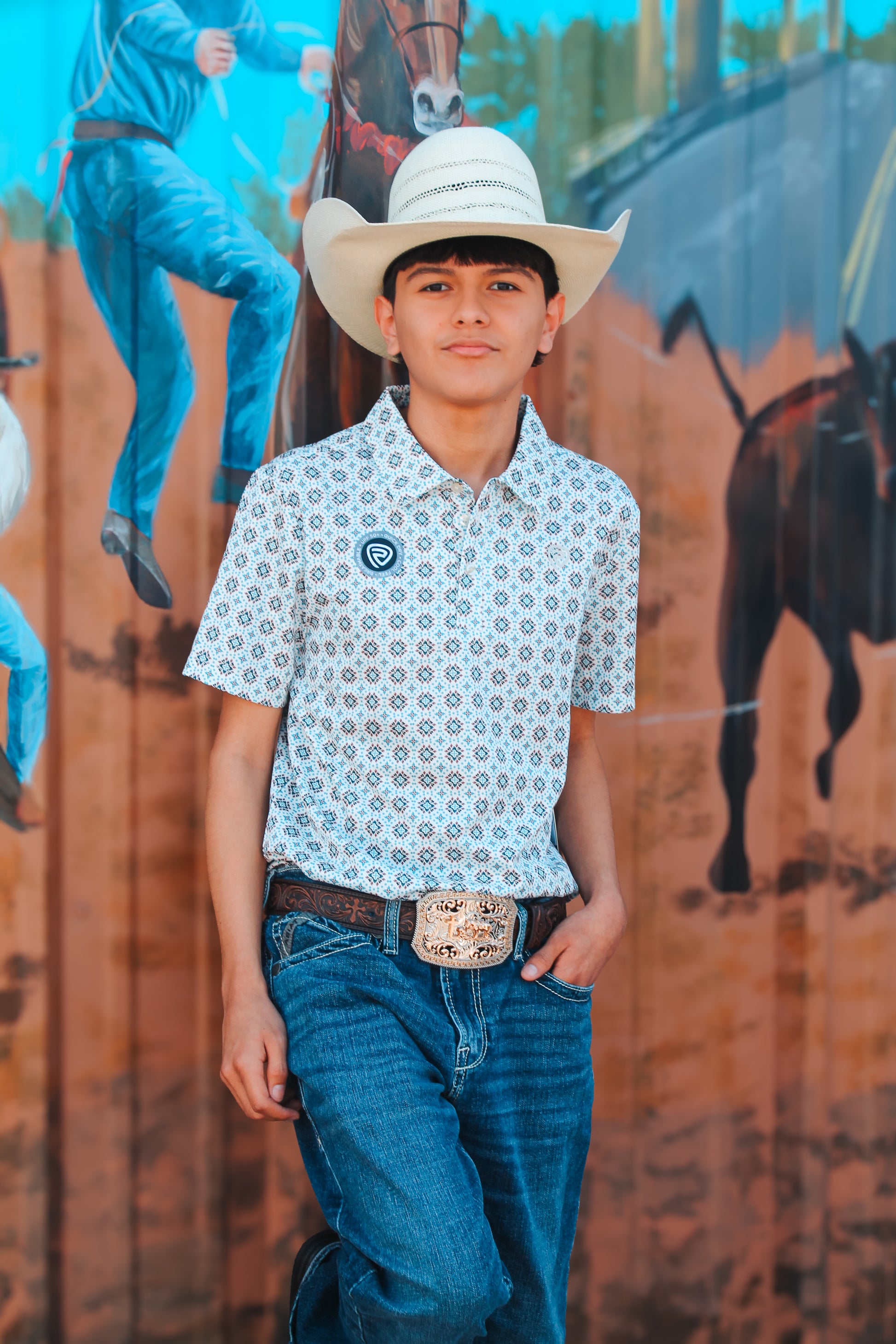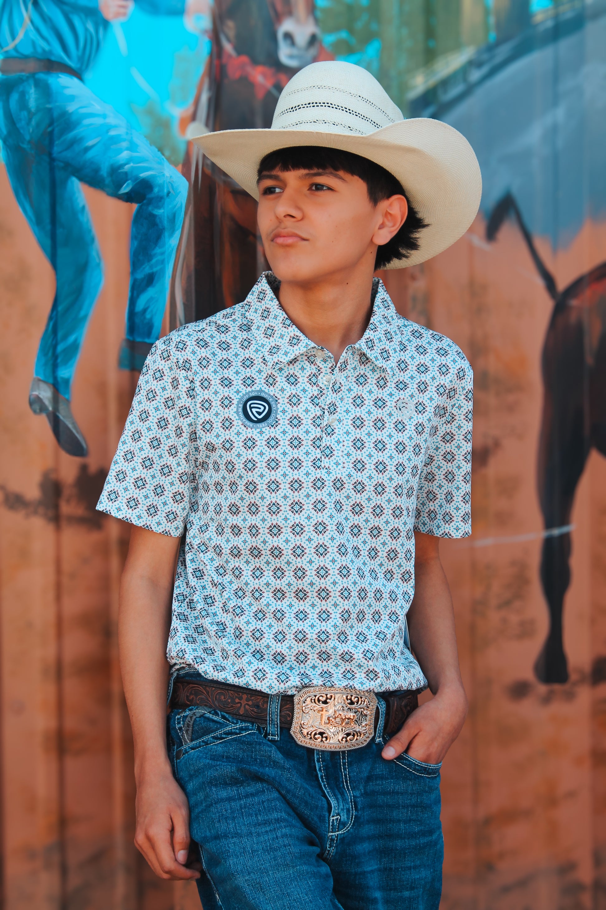 Upgrade your style game with our Men's Rock & Roll Denim Medallion Print Polo. This white polo features vibrant blue and red Aztec designs, perfect for making a statement. Made with quality fabric for a comfortable fit that will keep you looking sharp all day.