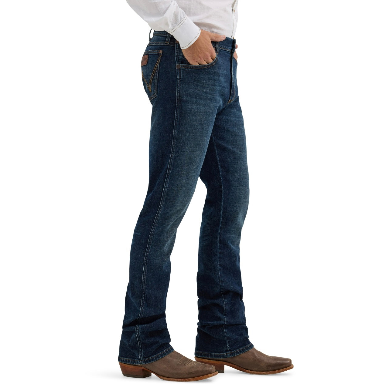 "Introducing Men's Wrangler Retro Slim Boot Sum25, the perfect combination of retro style and modern fit. With a lower waist and slim seat and thigh, these jeans flatter your figure while providing comfort. Plus, they easily fit over boots for a stylish look. Upgrade your denim collection now!"