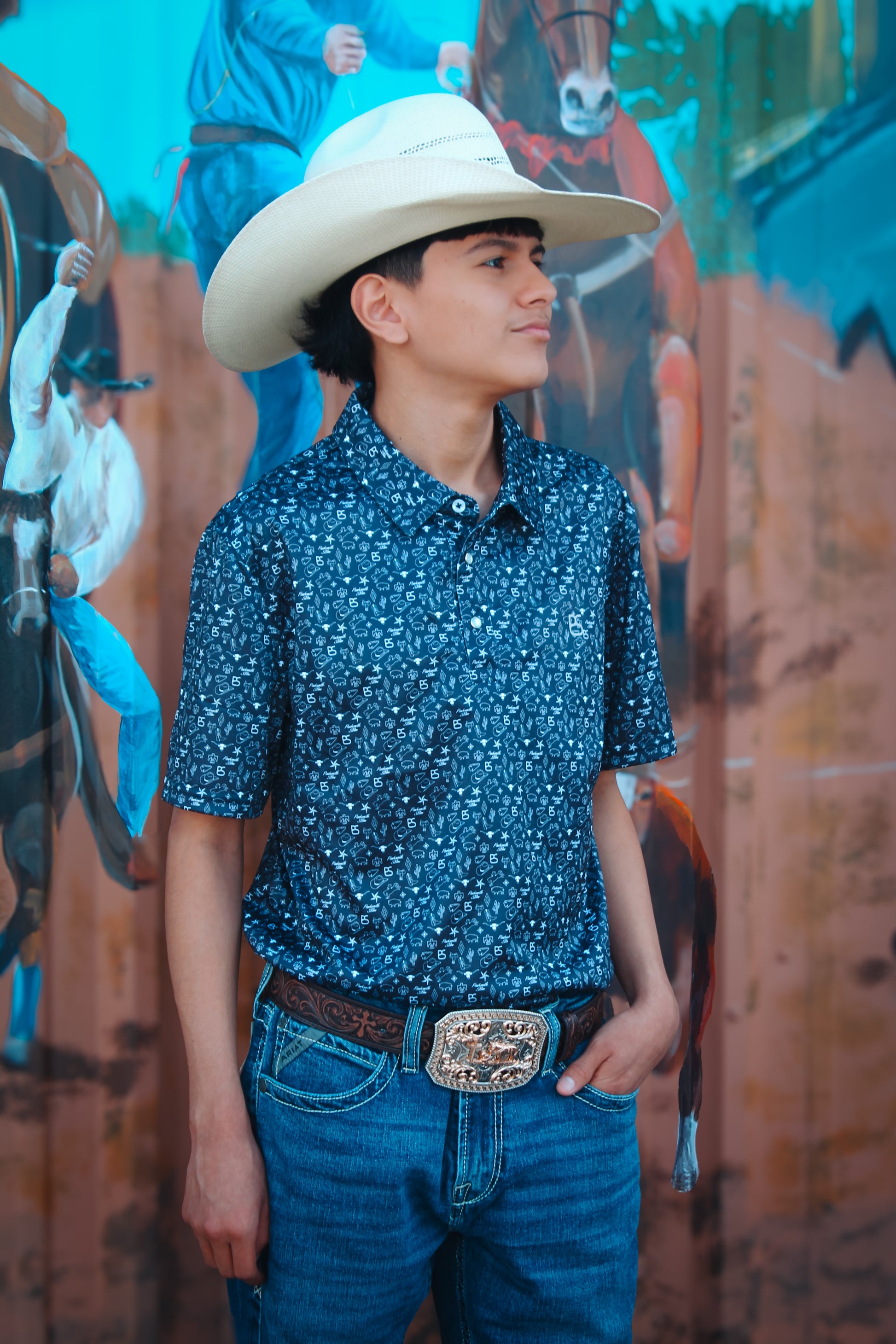This slim performance polo shirt for men features a black base with striking western life designs outlined in white. Crafted from high-quality materials, it offers both comfort and style. Perfect for the modern cowboy, this shirt combines functionality with fashion for a trendy and polished look.