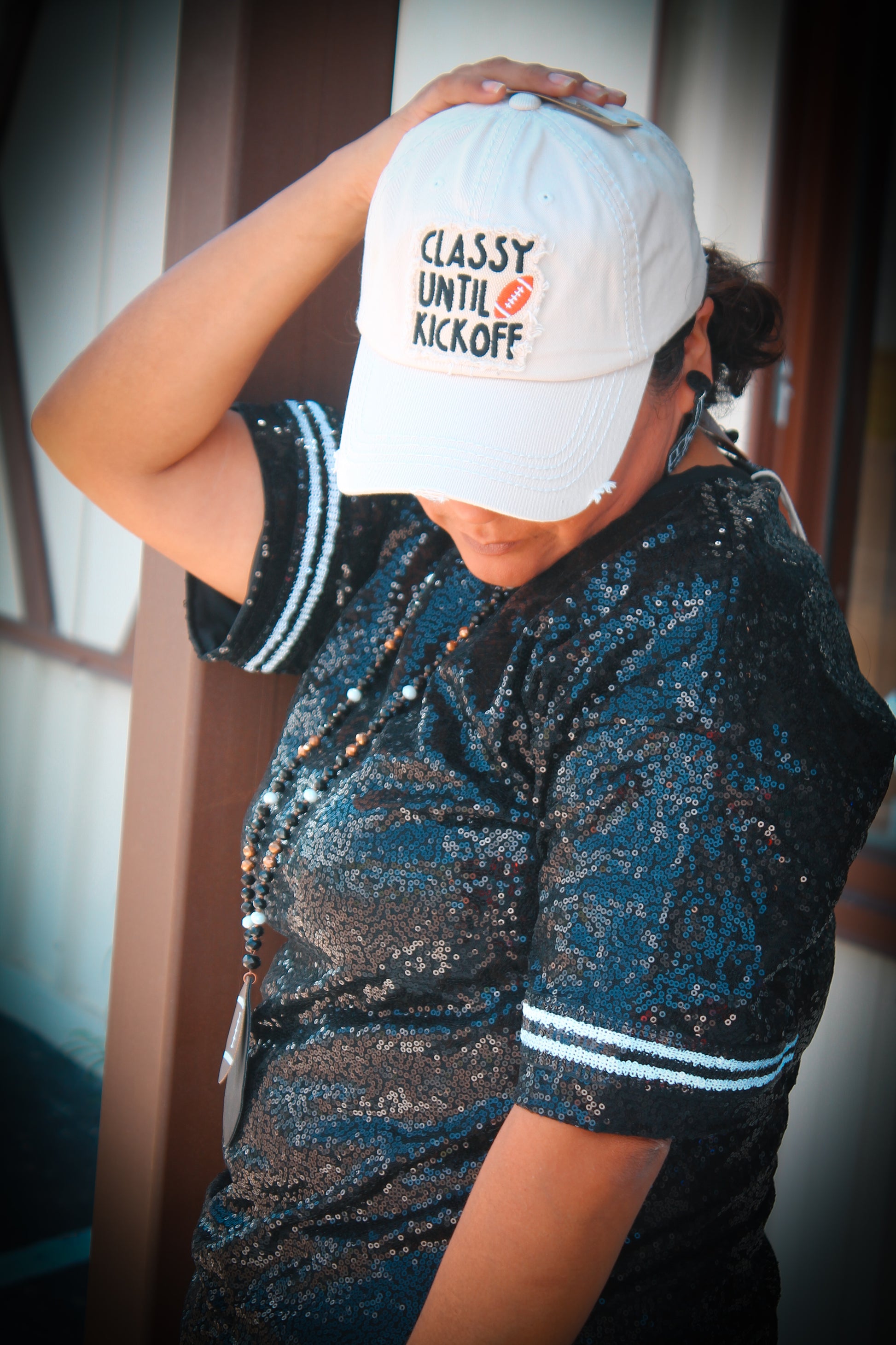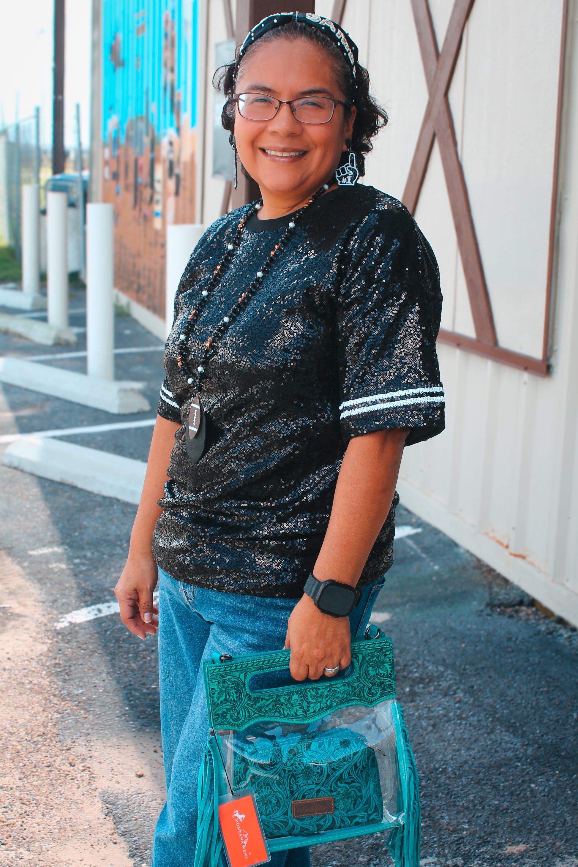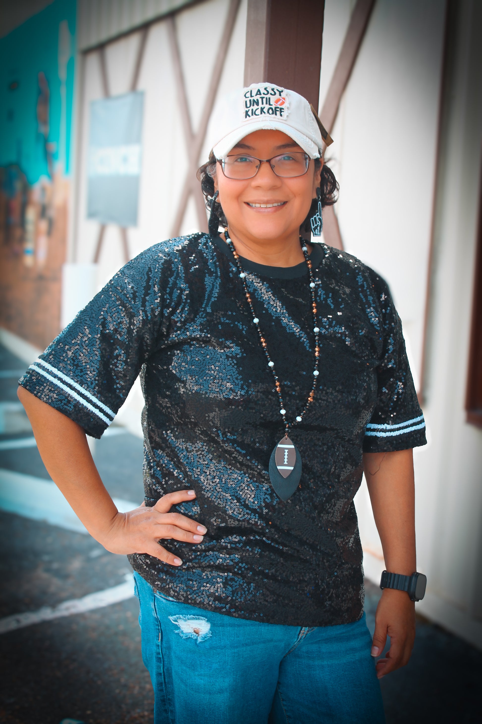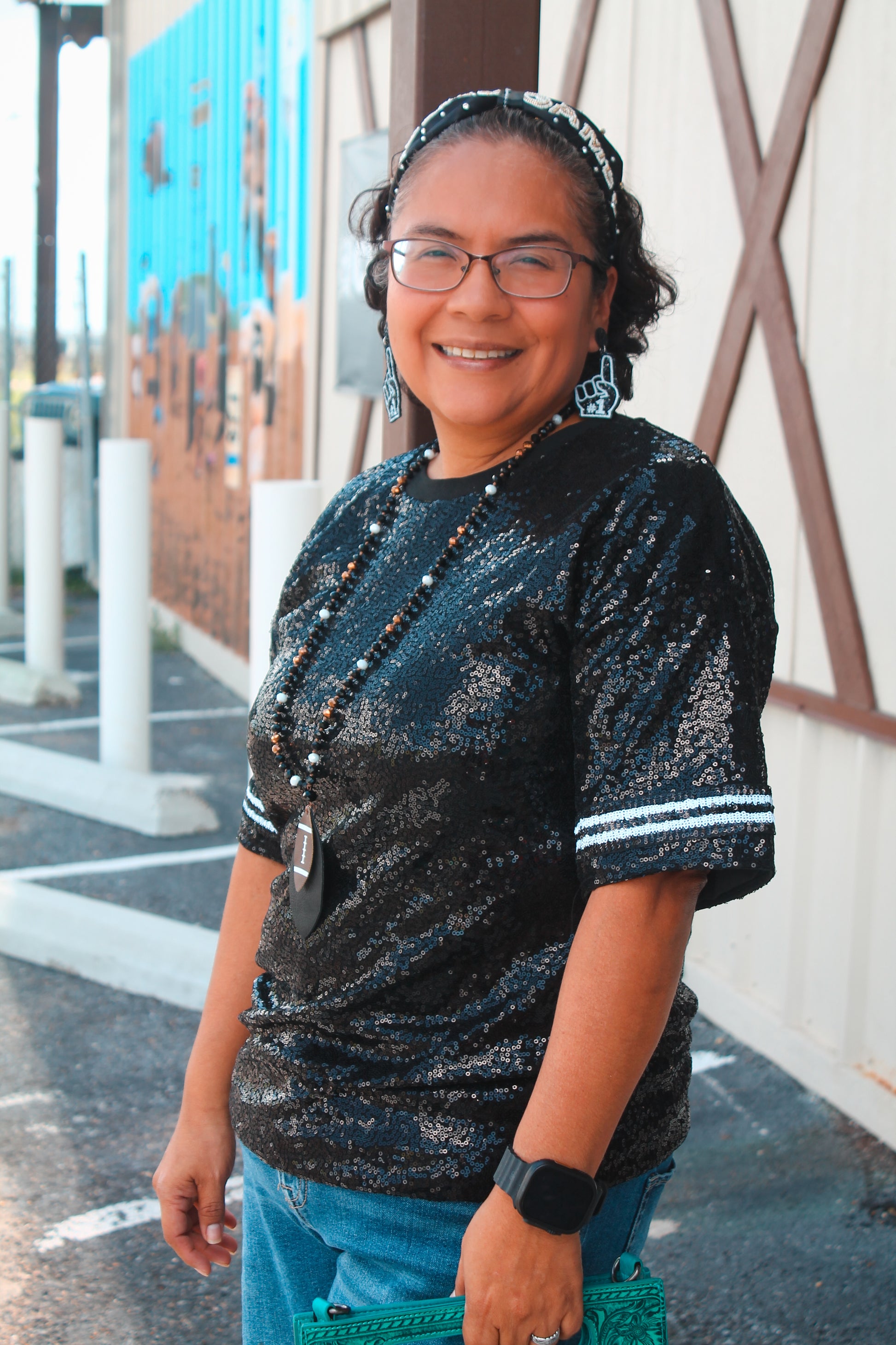The Midnight Sparkle Top is the perfect combination of comfort and style. With its oversized fit, you can easily move and stay cozy all day long. The sequin black top adds a touch of glamour, while the white black sleeve details elevate the look. Stay chic and comfortable in this versatile top.