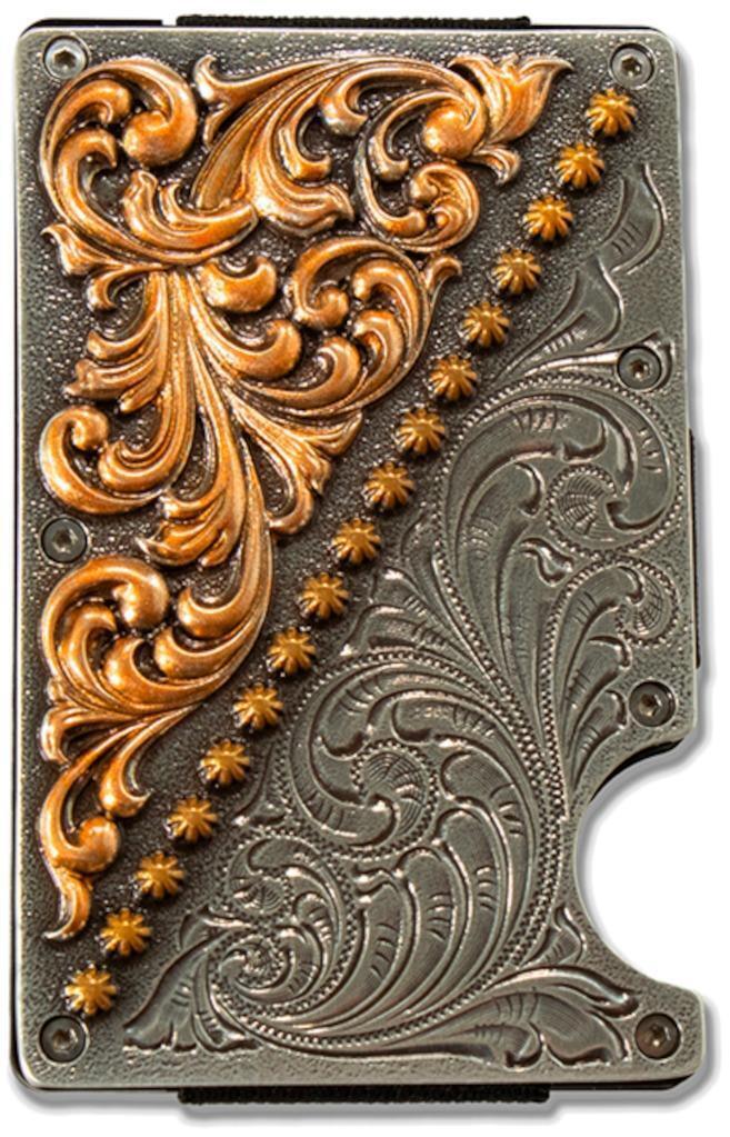 The Multi Finish 3D Smart Wallet features a decorative design with an antique silver scrolling background, accented by antique brass nail heads and pearl copper scrolling. The carbon fiber back ensures durability, while the stainless-steel clip provides secure storage. Its stylish construction merges functionality with aesthetic appeal.