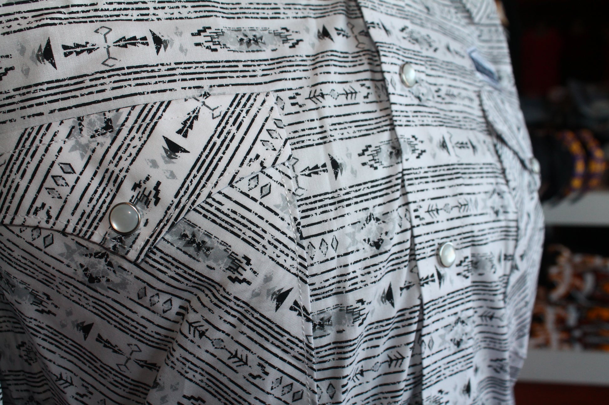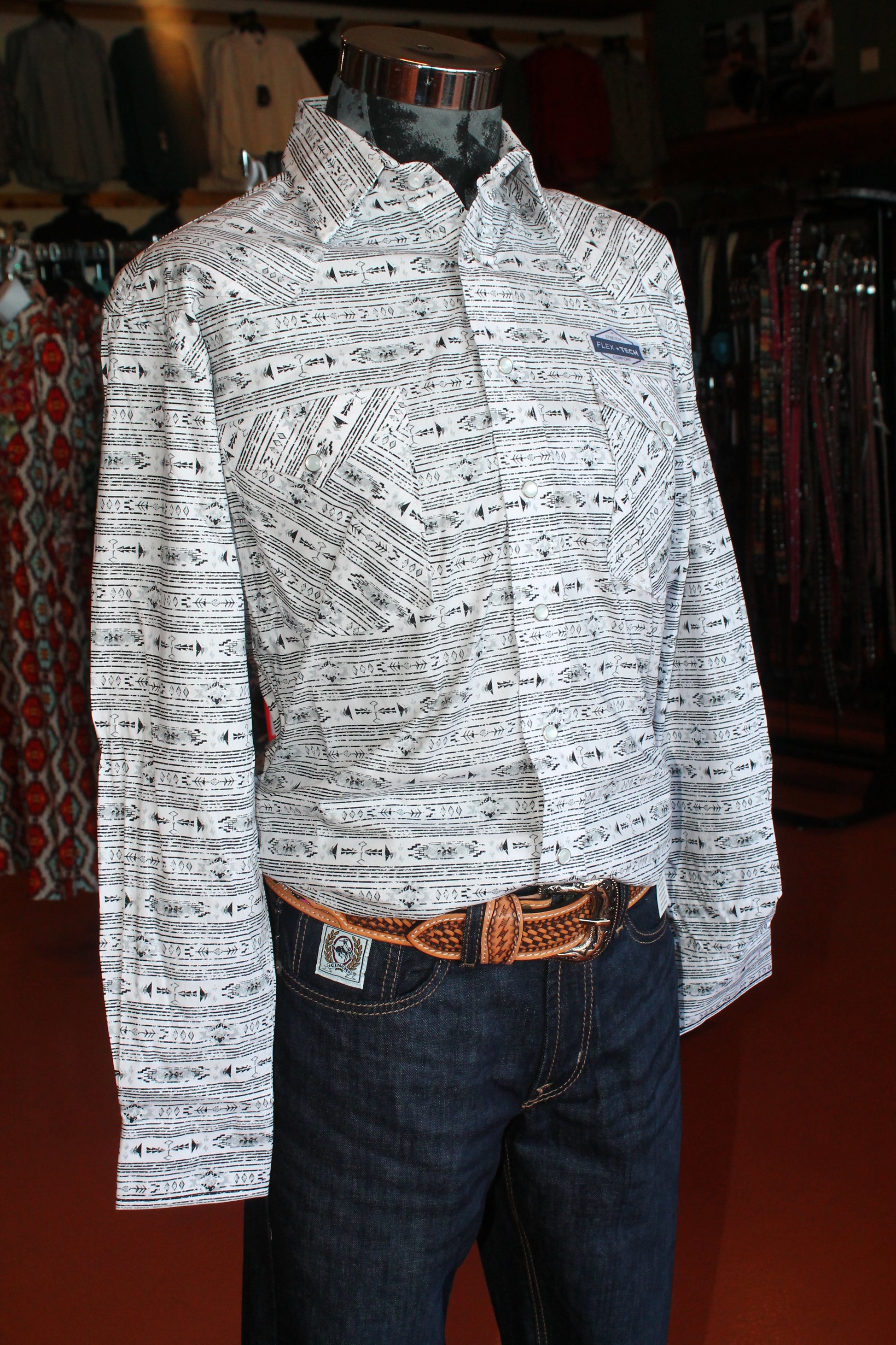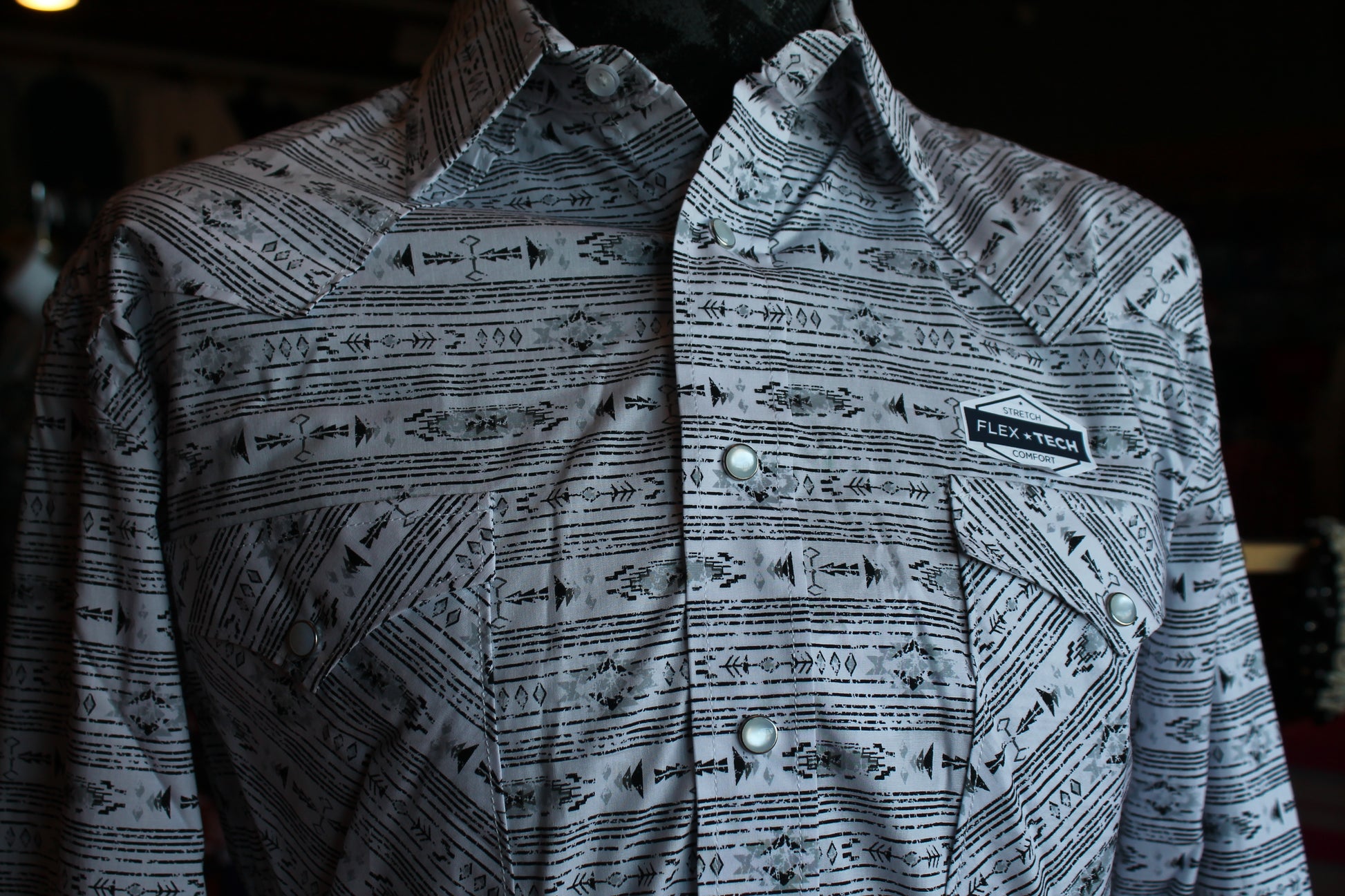 Crafted for the modern man, the Panhandle B/W LS Pearlsnap offers both style and comfort. With its classic pearl snap closure, two front pockets, and sleek black and white arrow print, this long sleeve shirt is perfect for any occasion. And with its Flex tech material, you'll never have to sacrifice comfort for fashion.