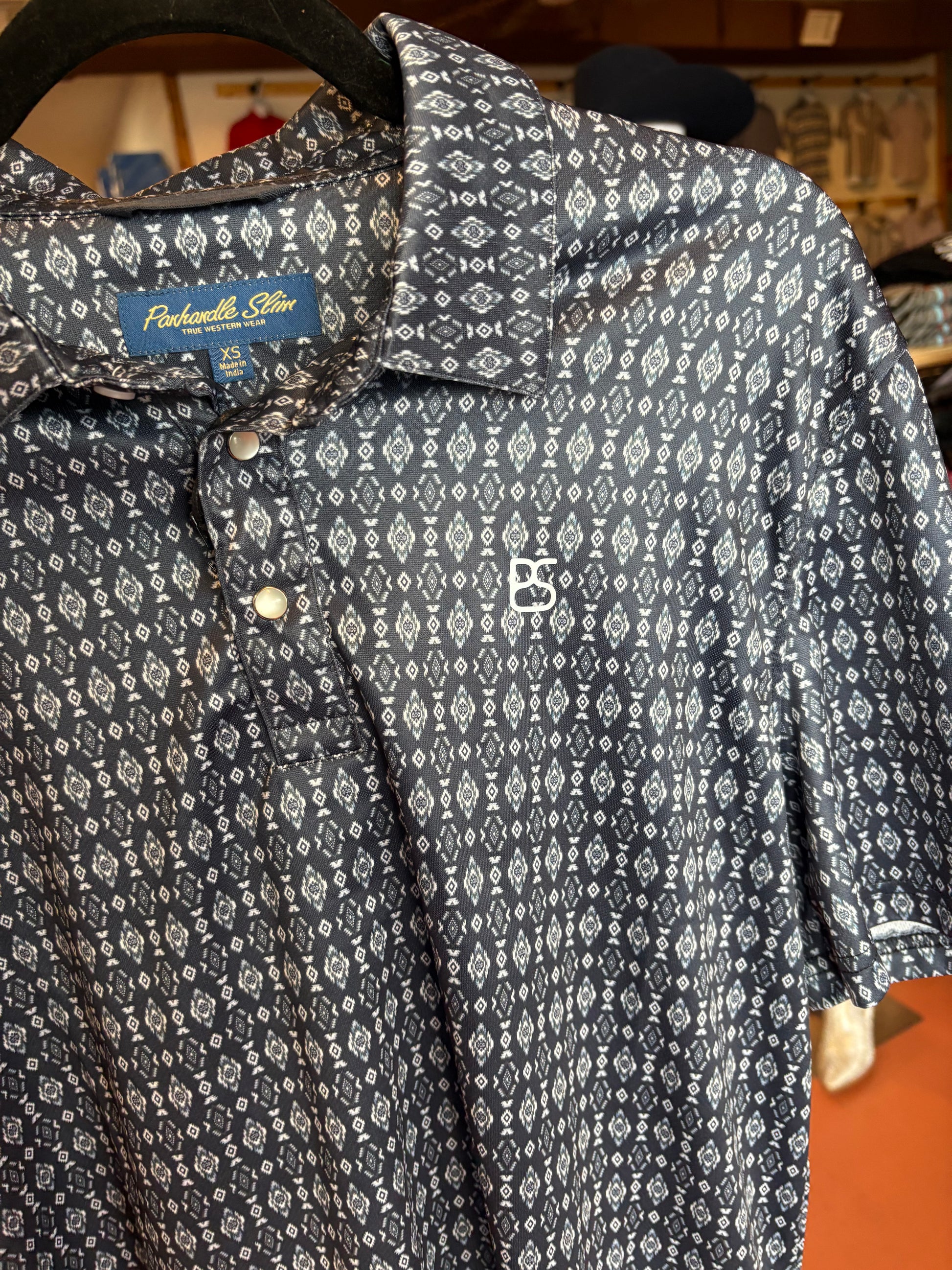 This Panhandle Slim Navy Diamond polo snap is a stylish addition to any wardrobe. The black polo features eye-catching white Aztec designs and is accented with elegant pearlsnap buttons. Made with high-quality materials, this polo offers both comfort and sophistication. Perfect for both casual and formal occasions.