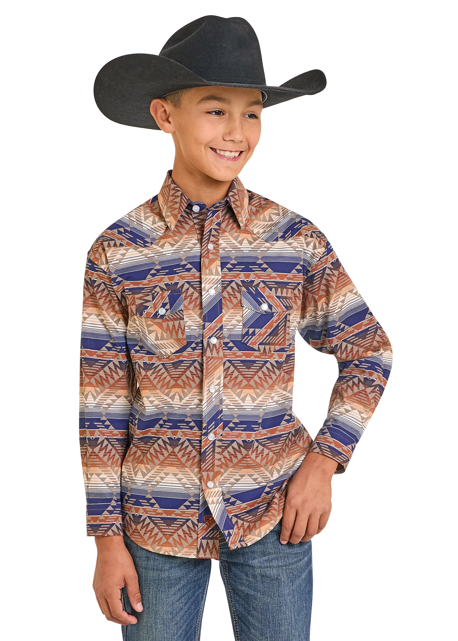 R&R BOYS' MULTI AZTEC LONG SLEEVE SNAP SHIRT