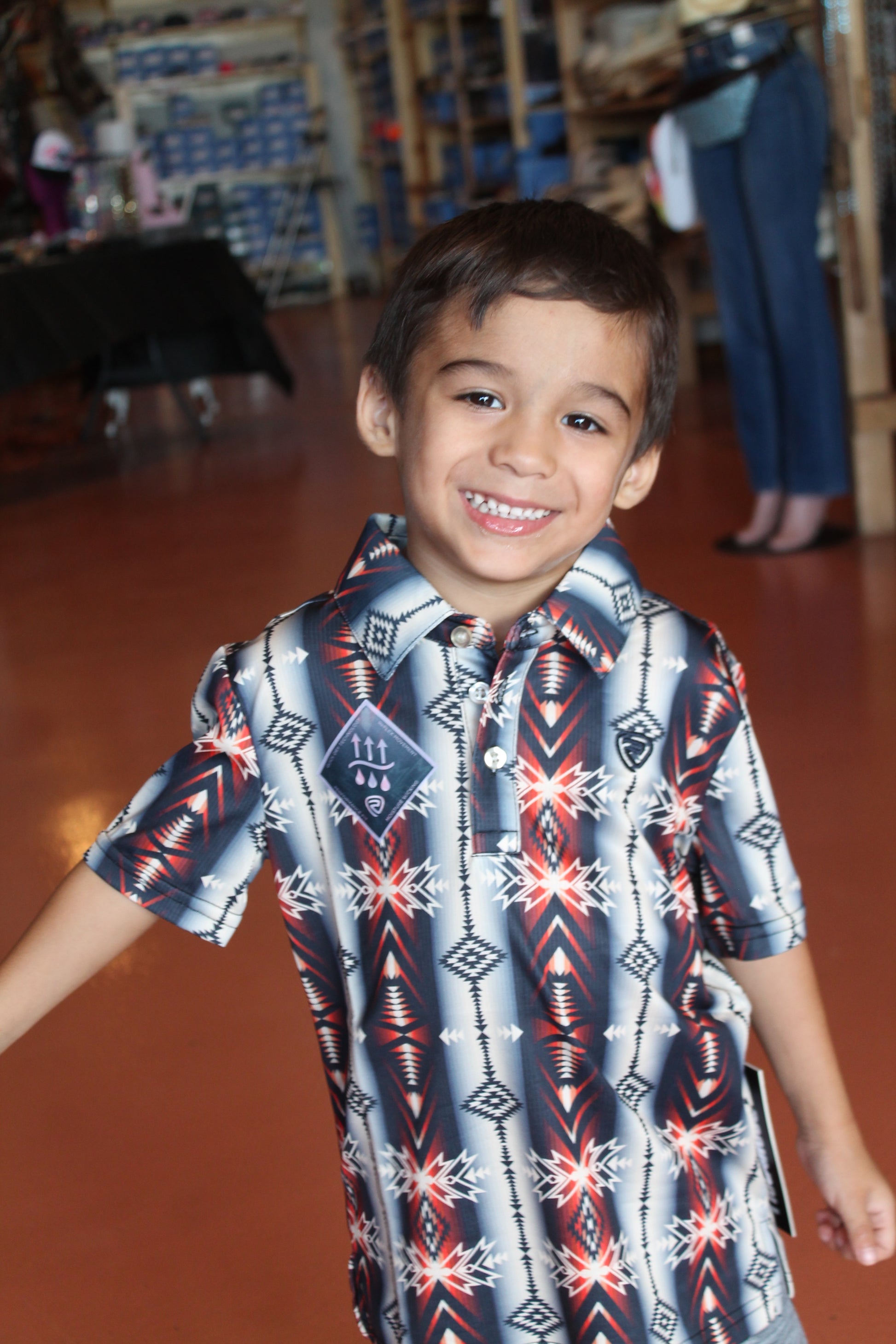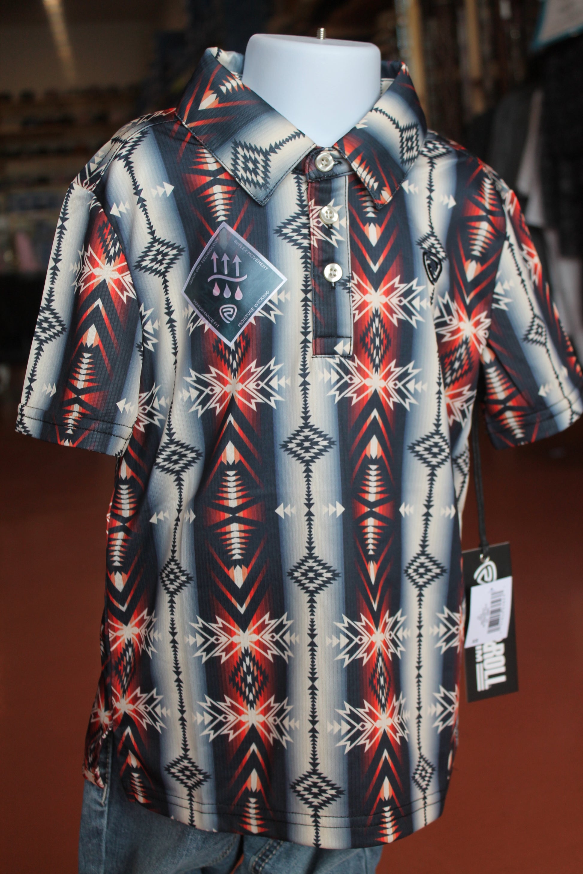 R&R orange and black red brow tones Aztec print youth kids top Introduce your young fashionista to the wild world of Aztec prints with our R&R Eye of the Tiger Youth Top. In bold orange and black tones, this top features a fierce Aztec pattern that will make any kid feel like a fashion icon. Let them express their unique style with this trendy top.