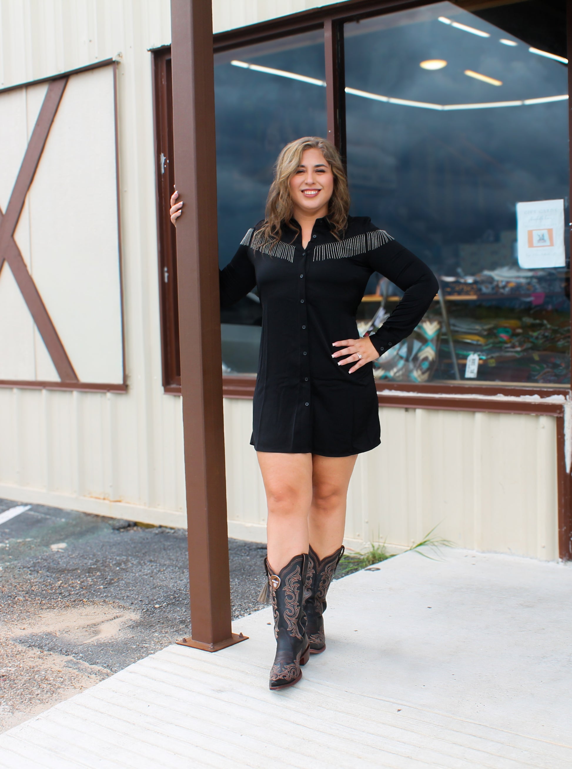 The R&R Mini Dress with Chain Fringe is a sleek and sophisticated addition to your wardrobe. Crafted from black satin, this knee length dress features long sleeves and a statement chain detail around the neckline. The collared design adds a touch of elegance, making it perfect for any occasion.