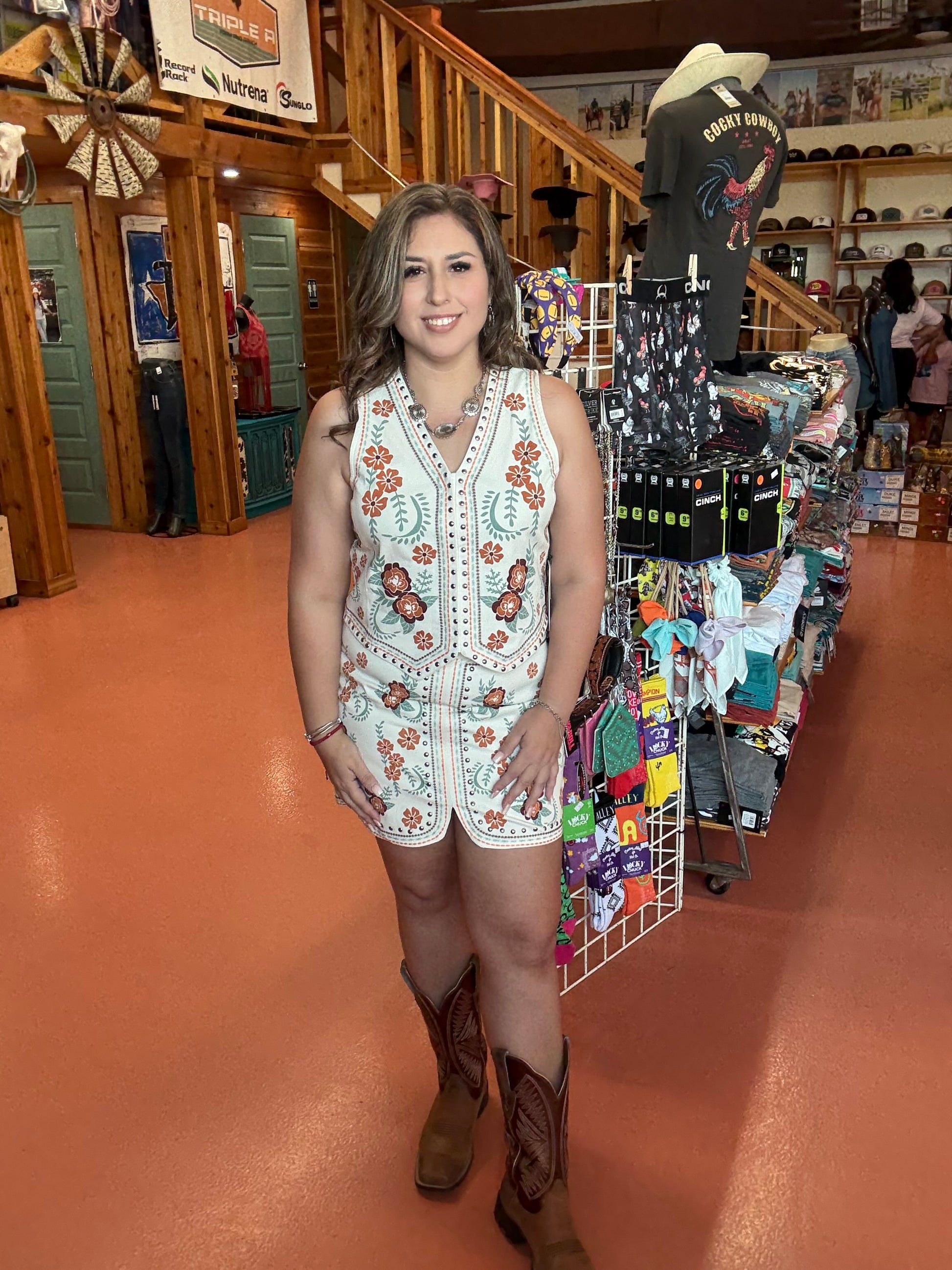 Elevate your style with R&R Women's Floral Print Skirts. Made for the modern woman, this rock and roll skirt features a beautiful off-white base with vibrant red and orange floral designs, accented by green stems. The border glistens with delicate beaded details, adding a touch of sophistication to any outfit.