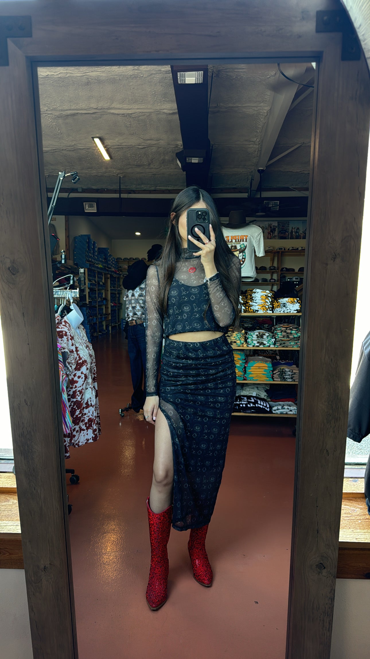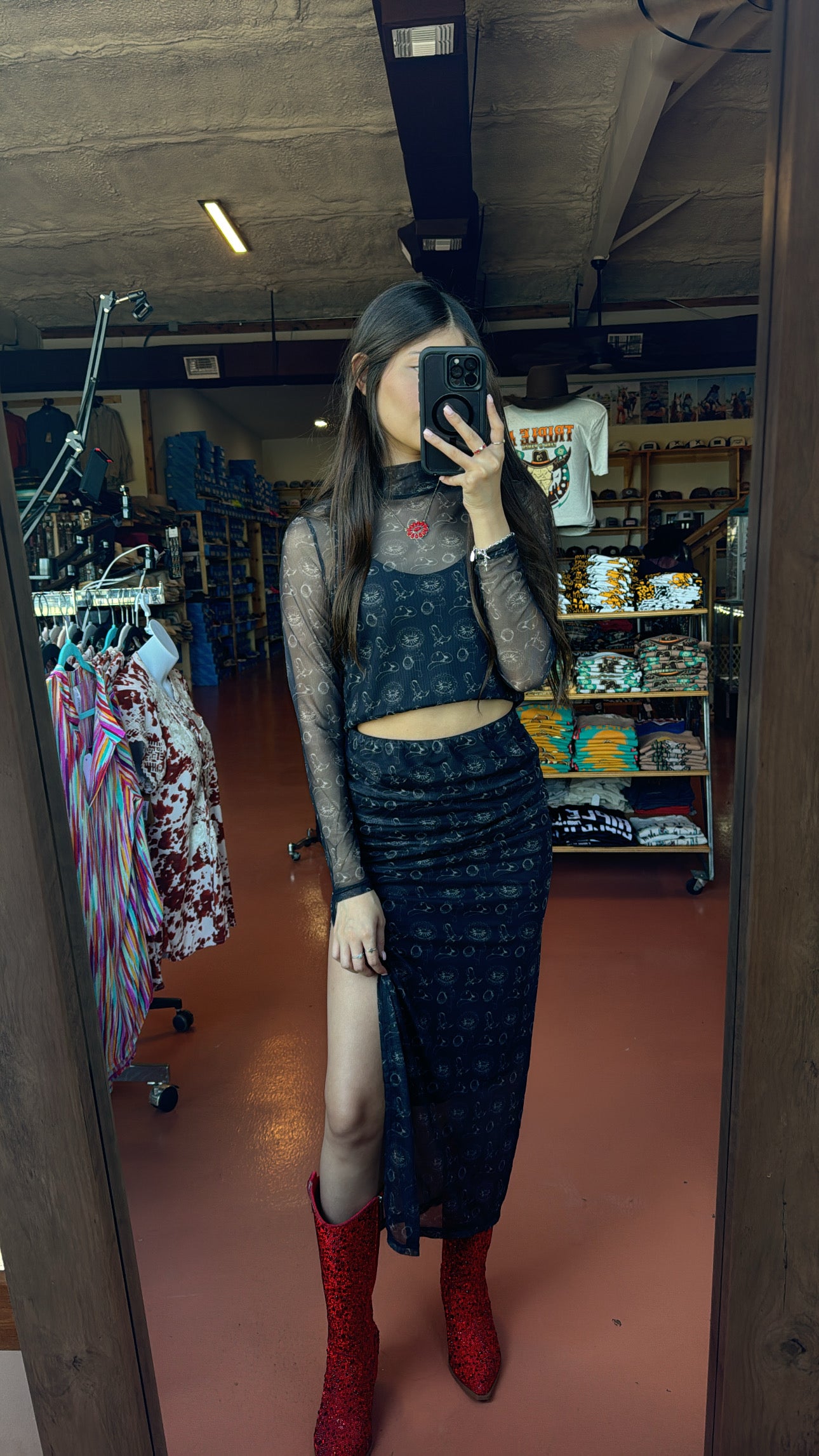 Looking for something edgy and unique? Then look no further than R&R Women's Mesh Buckle & Boots Mesh Top! This top features a sleek black mesh material and is accented with intricate images of hats, saddles, and charms. Perfect for adding a touch of rebellious charm to any outfit.
