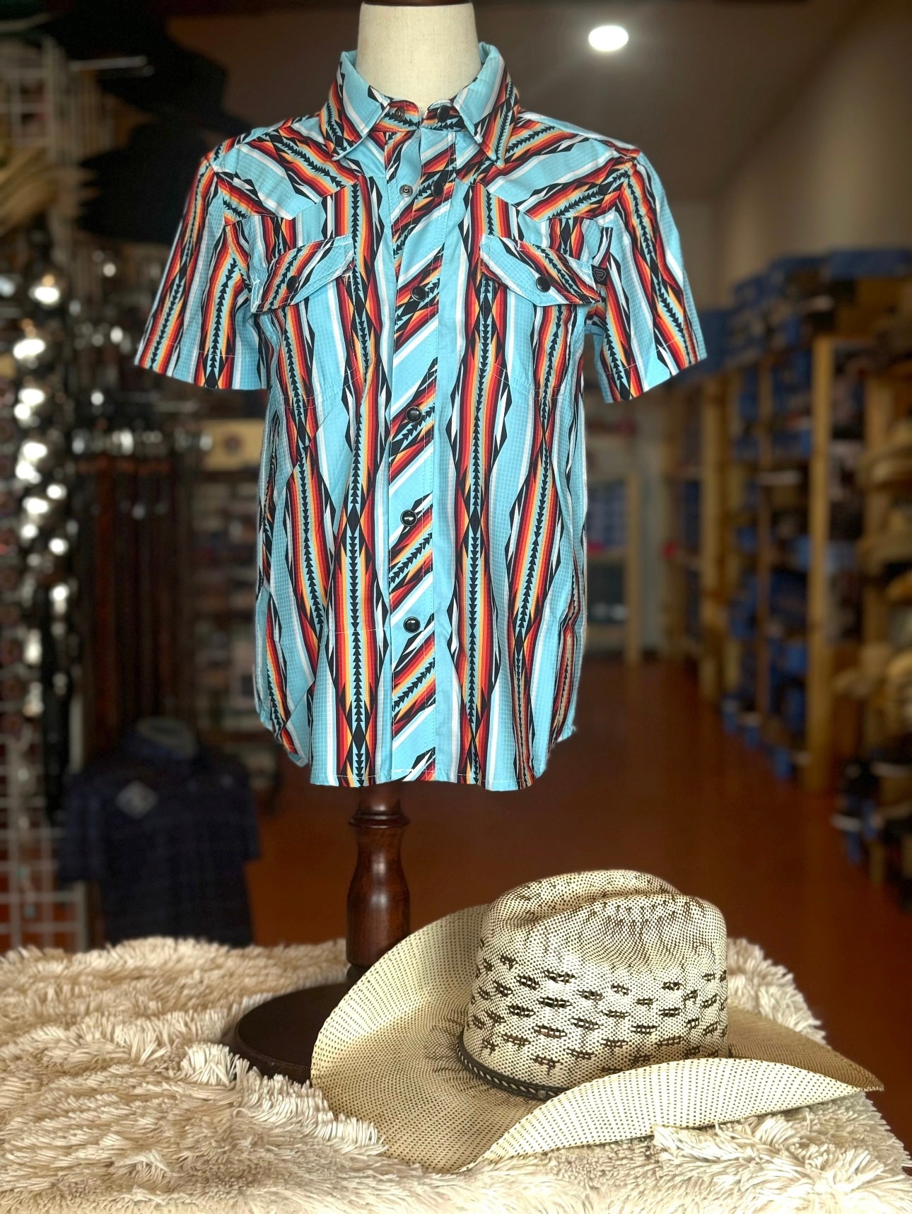 Experience the bold and vibrant style of Rock and Roll Denim with our R&R YOUTH Bright Turquoise Aztec Snap SS. Perfect for youths, this short sleeve top features a stunning Aztec design and pearl snaps. Stay comfortable and protected with UPF 50 sun protection, moisture-wicking, and breathable fabric. Step up your western collection today!
