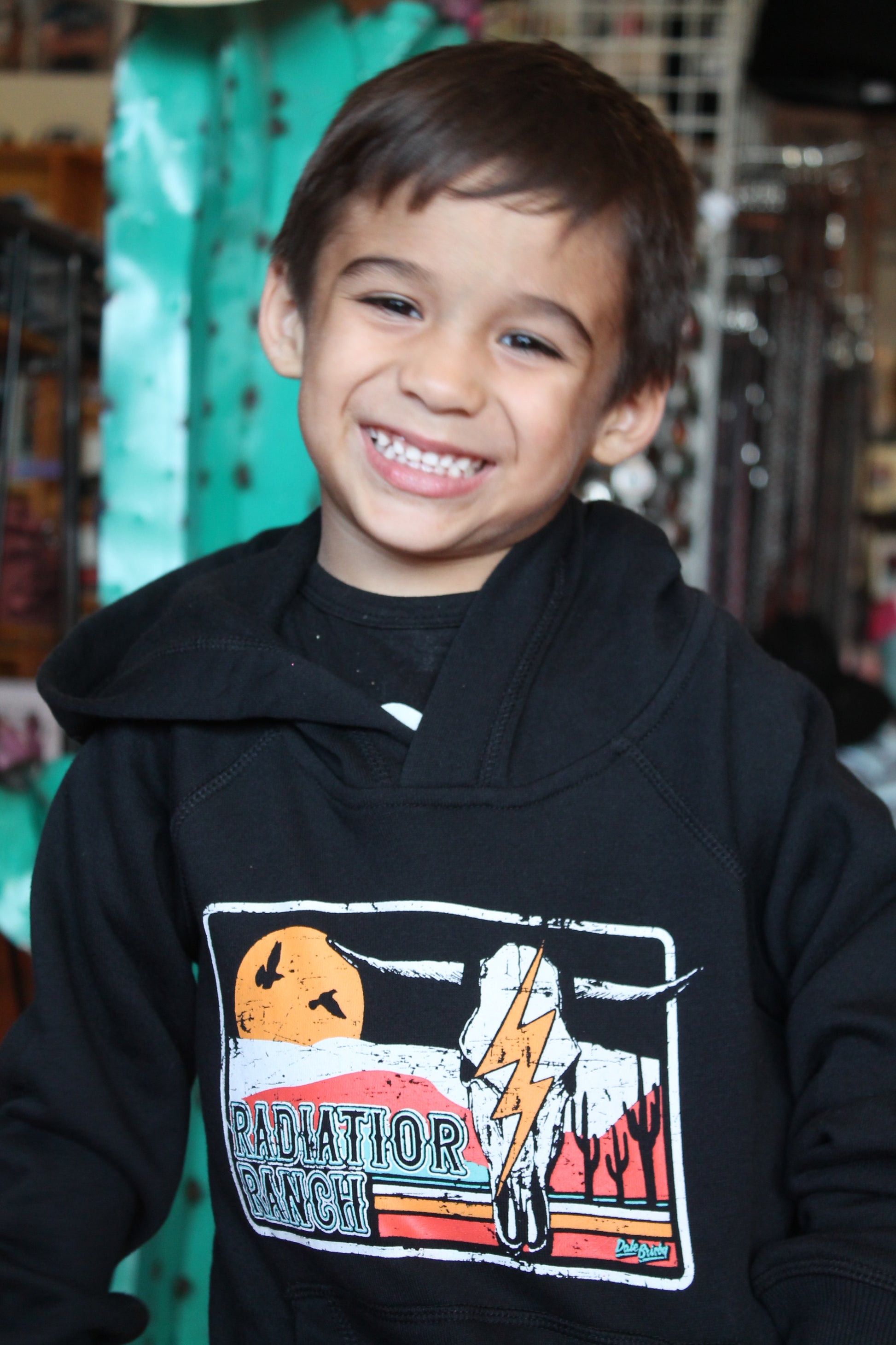 Unleash your inner rebel with the R&R Youth Dale 'Radiator Ranch' Hoodie. This bold black hoodie features a unique square graphic with a striking bull skull and lightning bolt, making a statement wherever you go. Stay comfortable and stylish with this must-have piece.