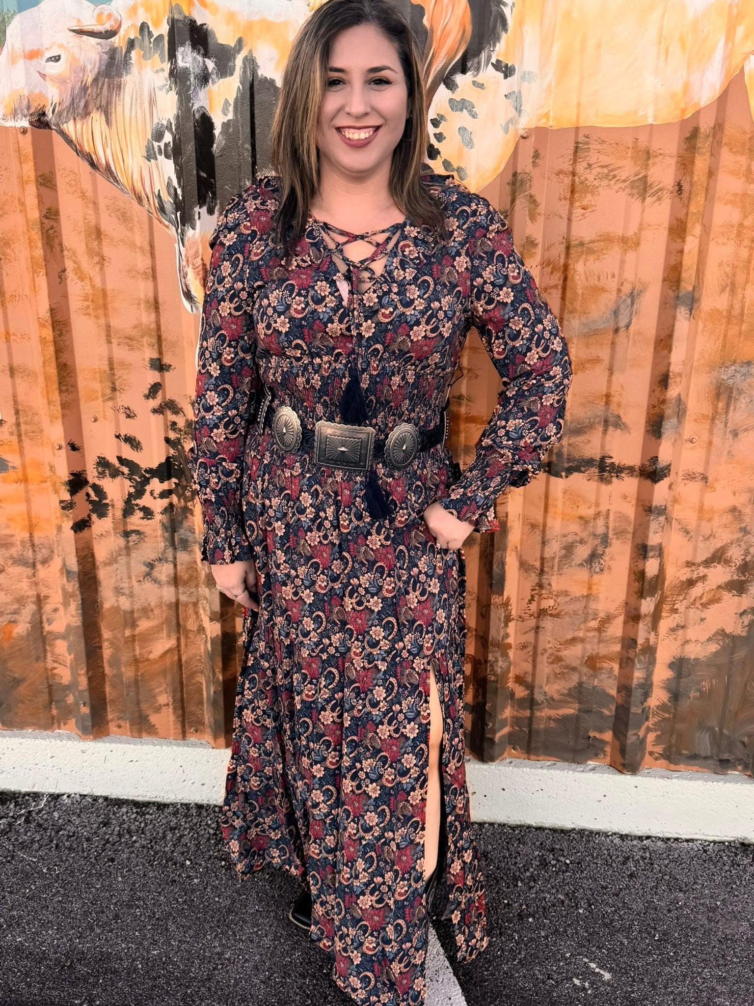 This ankle-length black dress features a beautiful floral horseshoe print, complemented by peasant sleeves and a tassel neck tie. With a leg slit for added style, this dress is perfect for any occasion.