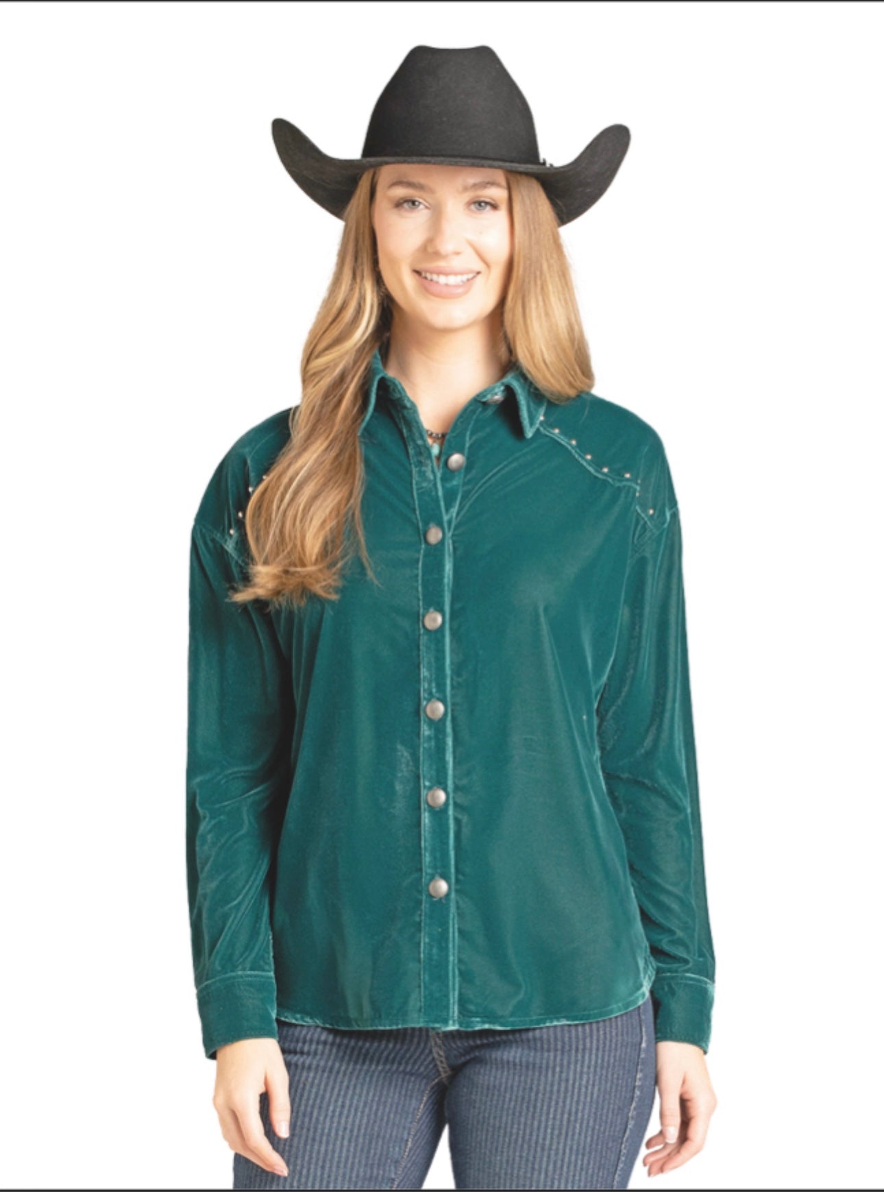 ROCK & ROLL DENIM WOMEN'S OVERSIZED STUDDED TEAL VELVET CONCHO BUTTON SHIRT