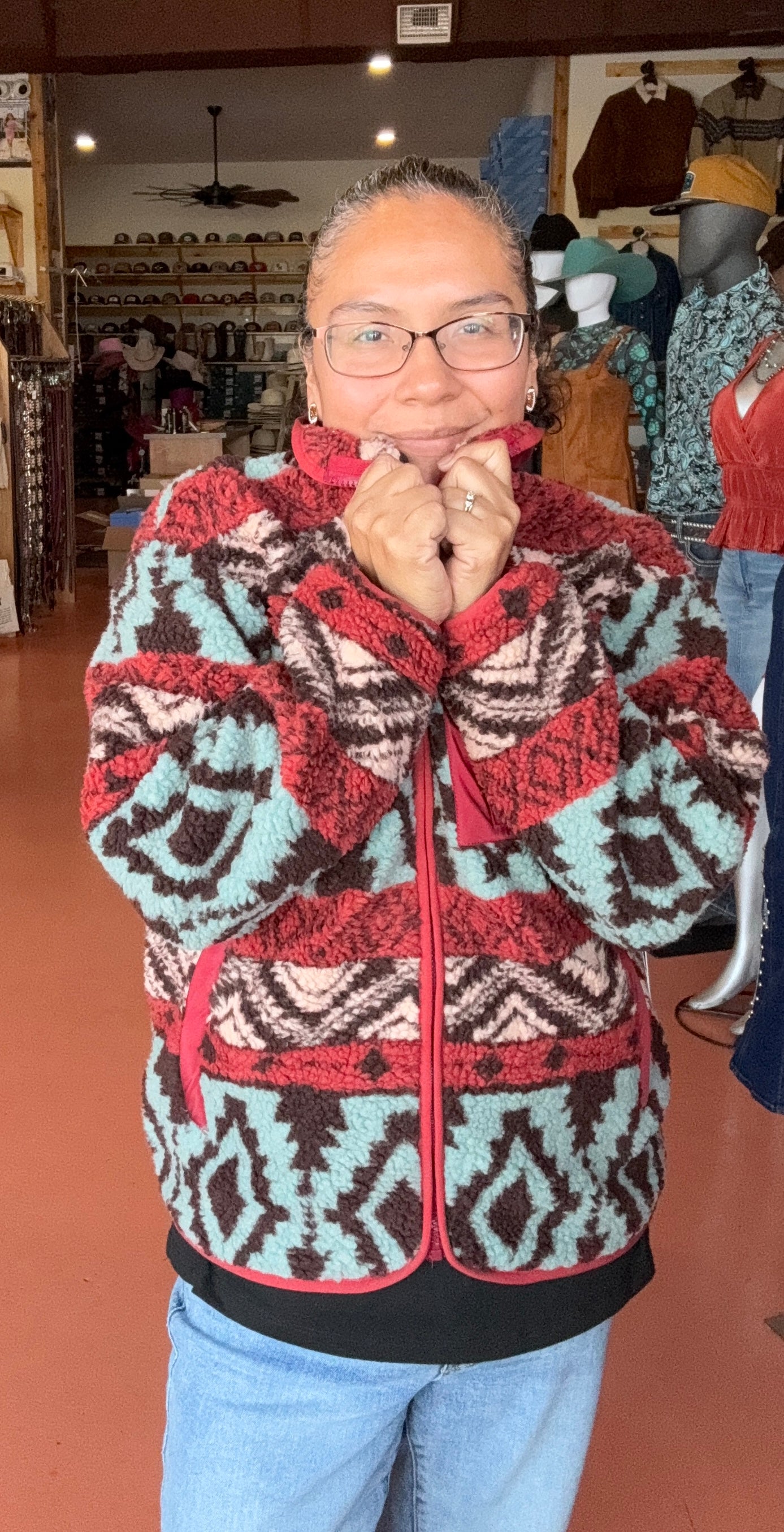 Expertly crafted with an Aztec print, this Sherpa jacket boasts a statement-making design. The accent chest pocket with zipper closure and side pockets with zipper closure add functionality and style. Perfect for staying warm and adding a touch of boho-chic to any outfit.