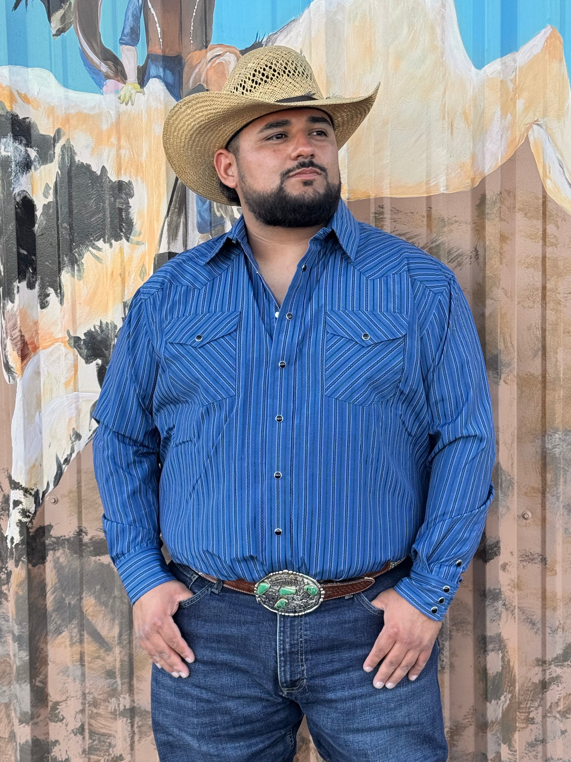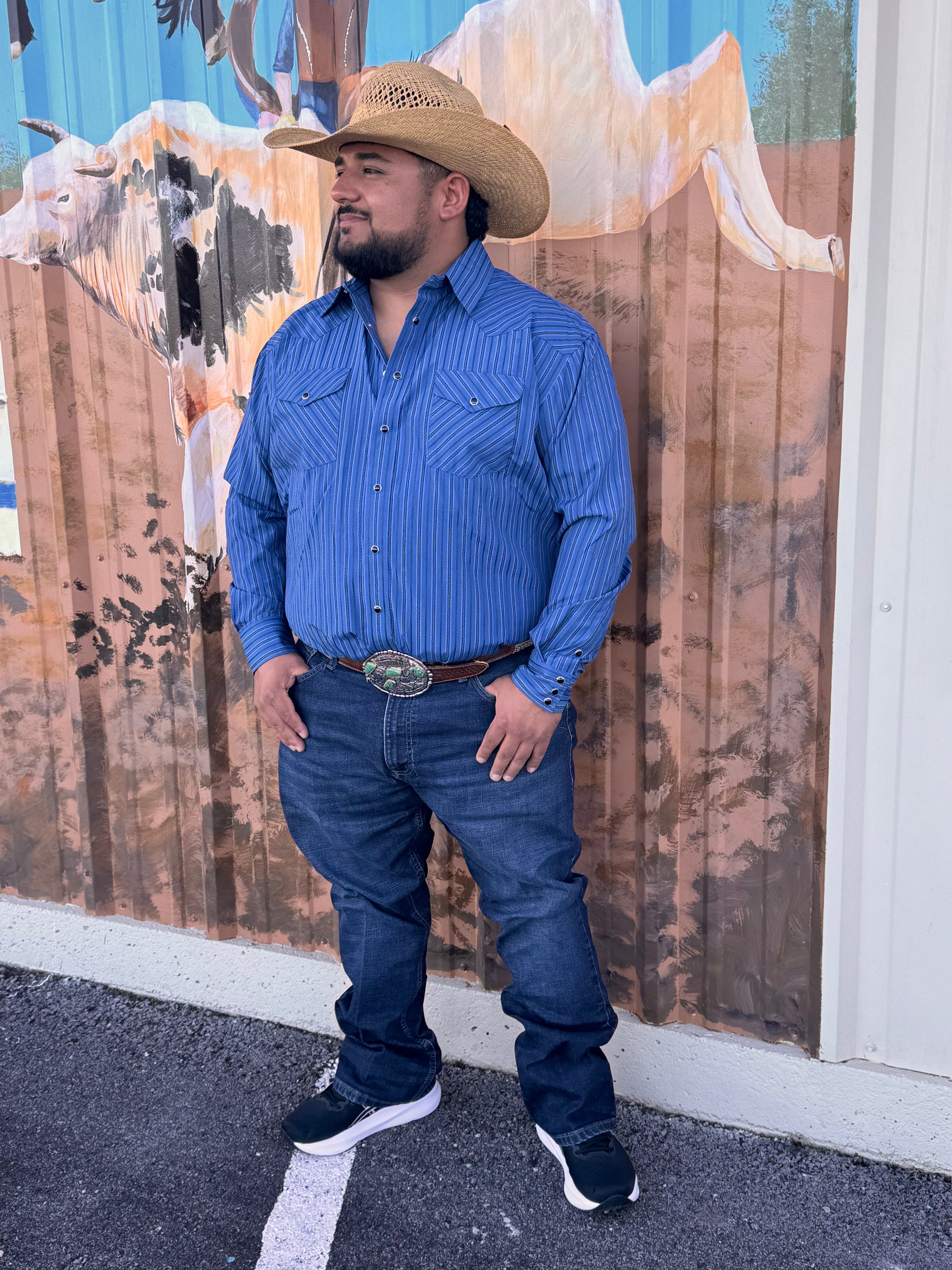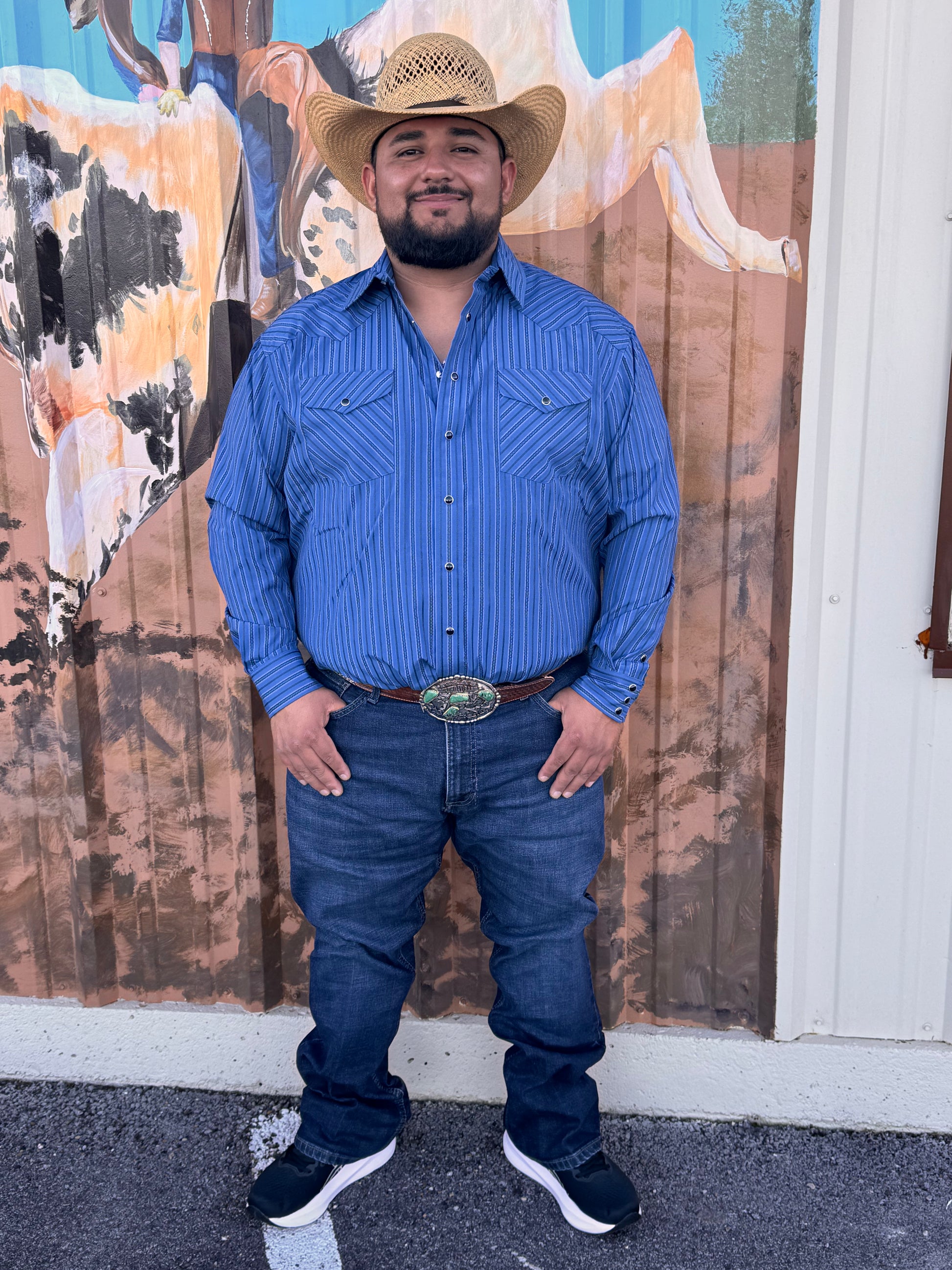 Add a touch of Western style to your wardrobe with the Blue Stripe Long Sleeve Snap Shirt. Made from a cotton/poly blend, this shirt is designed for comfort yet stylish for any occasion. The long sleeves and double chest pocket offer both comfort and functionality, making it a versatile addition to your collection.ย