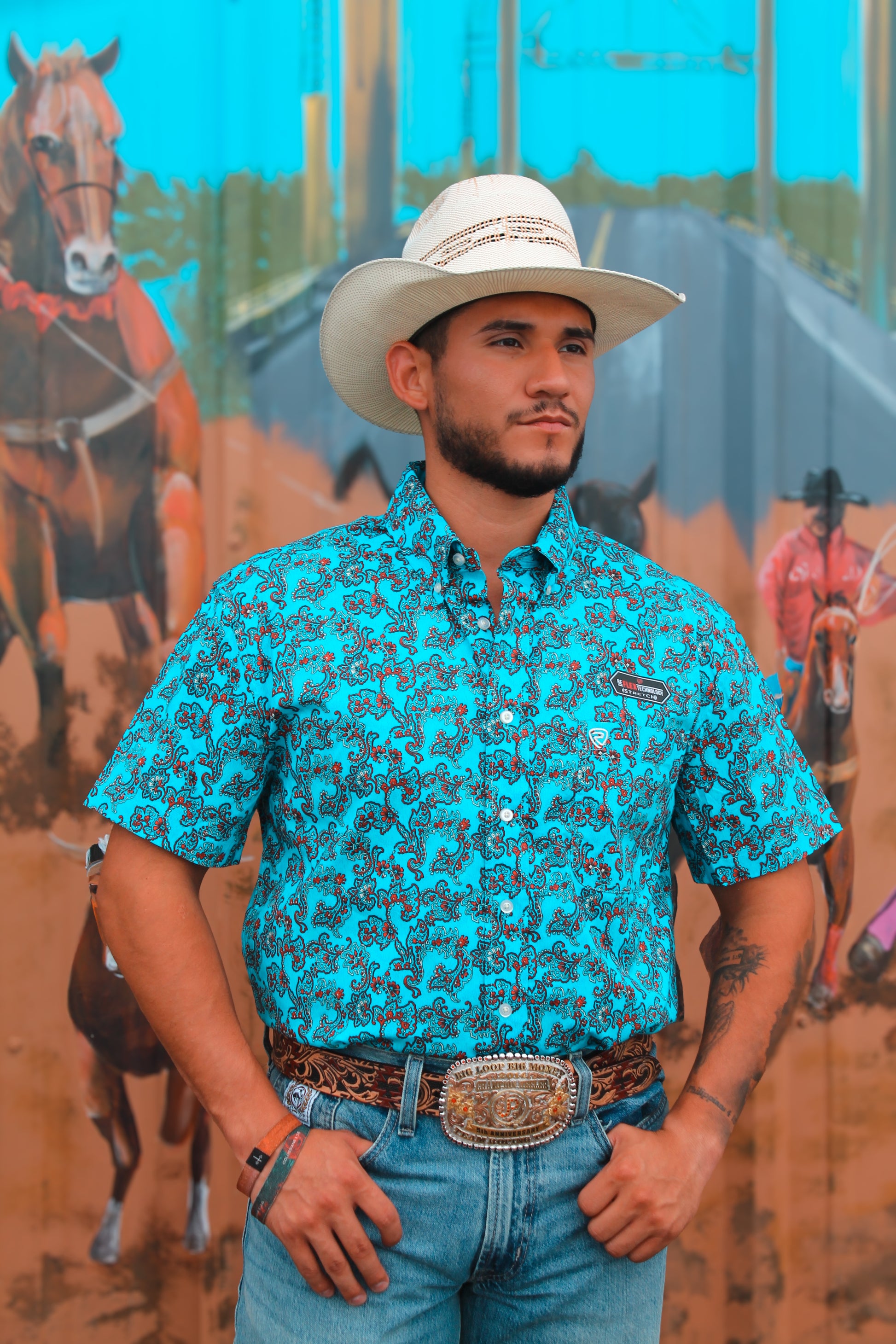 This Rock & Roll Paisley Button Up in Bright Turquoise features a vibrant red paisley design on a cool blue short sleeve shirt. Perfect for making a statement with style, this button up combines bold colors and timeless patterns for a unique and trendy look. Elevate your wardrobe with this eye-catching piece.