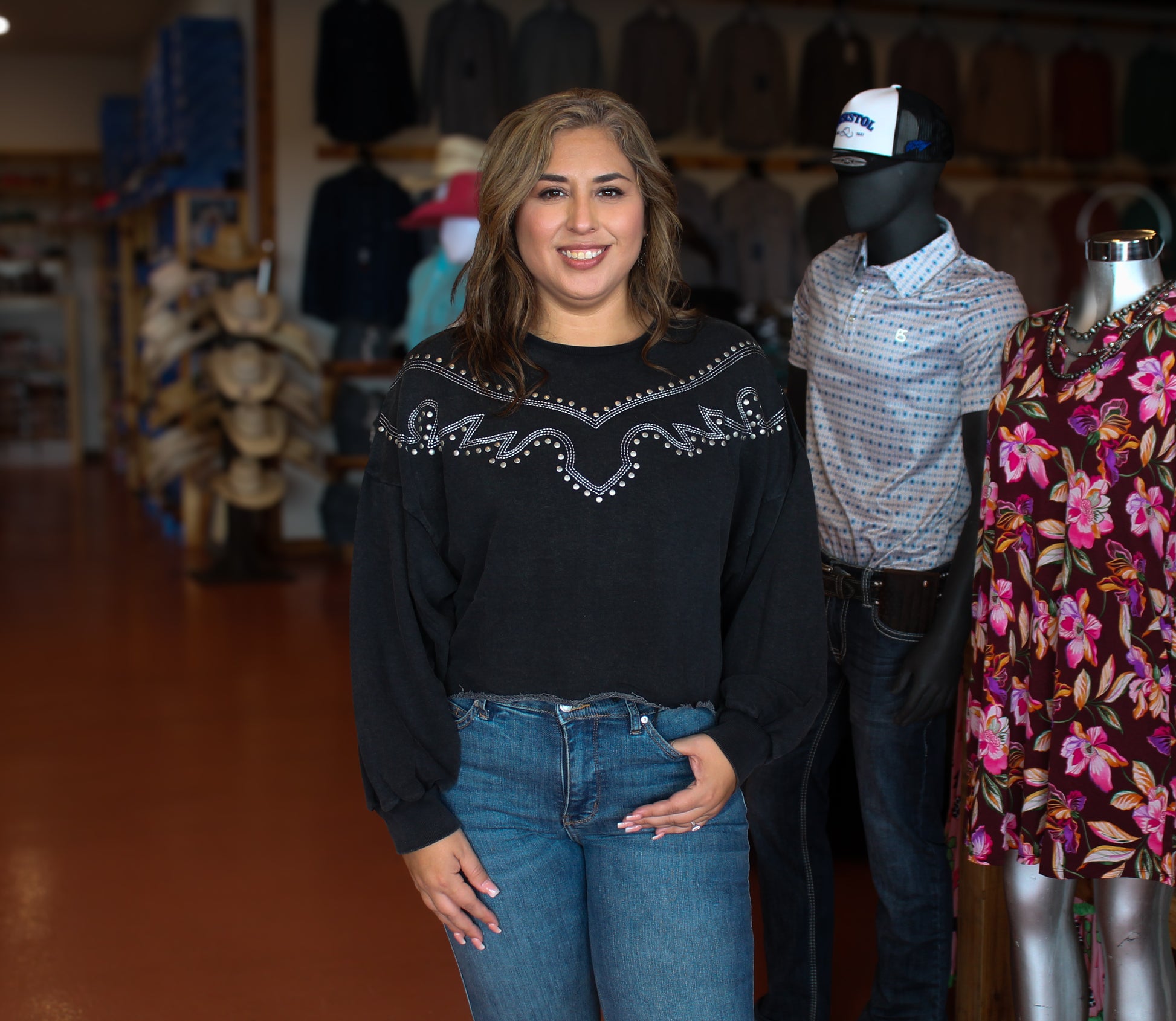 Upgrade your wardrobe with our Rock & Roll black embroidered sweatshirt. This acid washed piece features Aztec studding, giving it a unique and edgy look. Stay warm and stylish with this one-of-a-kind sweater.