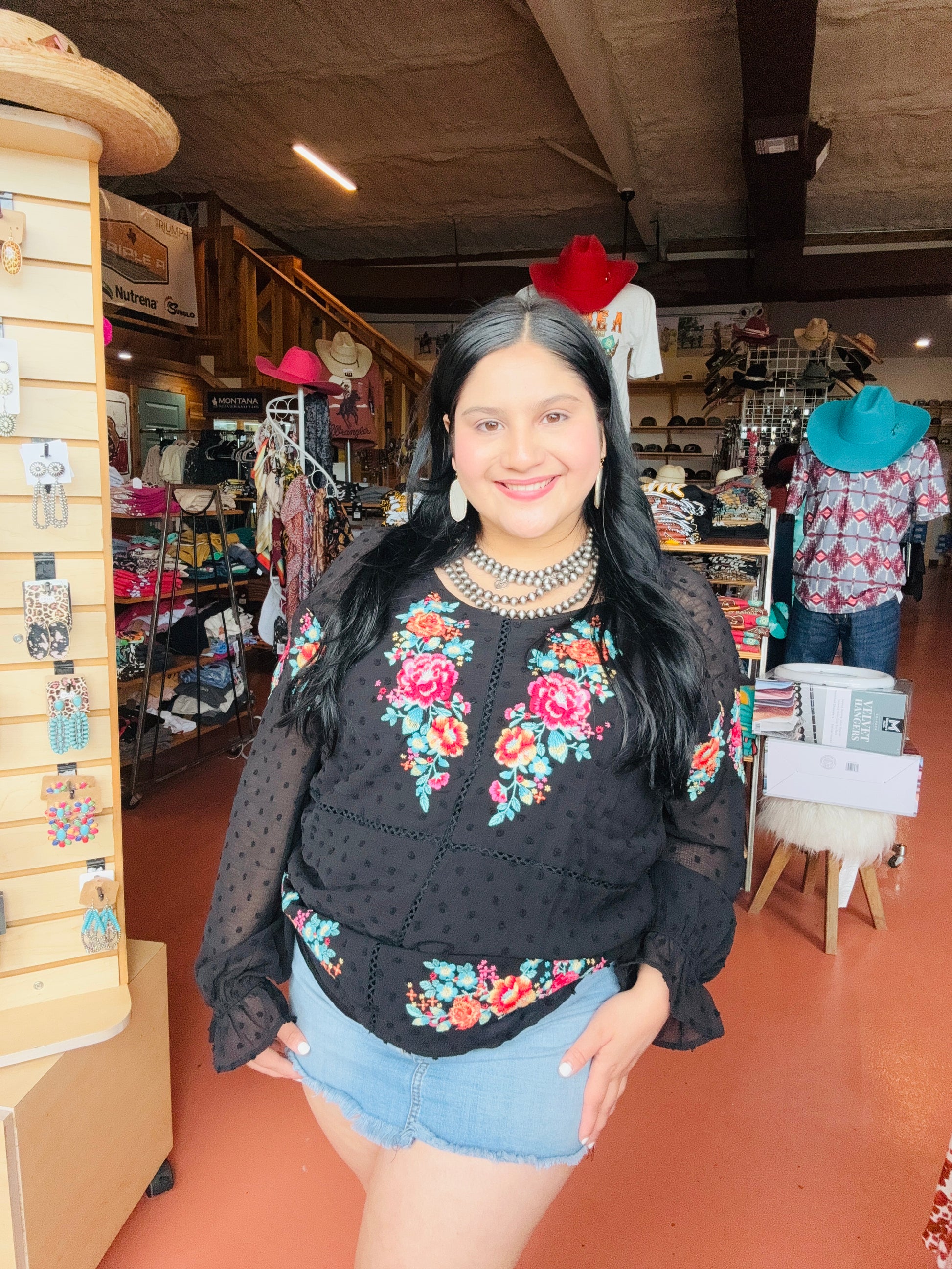 Introducing the stunning Savanna Jane Black/Floral Long Sleeve Top! This versatile top features beautiful floral embroidery on the classic black, long-sleeved design. Perfect for any occasion, this top will elevate your look and make you feel confident and stylish. A must-have in your wardrobe.