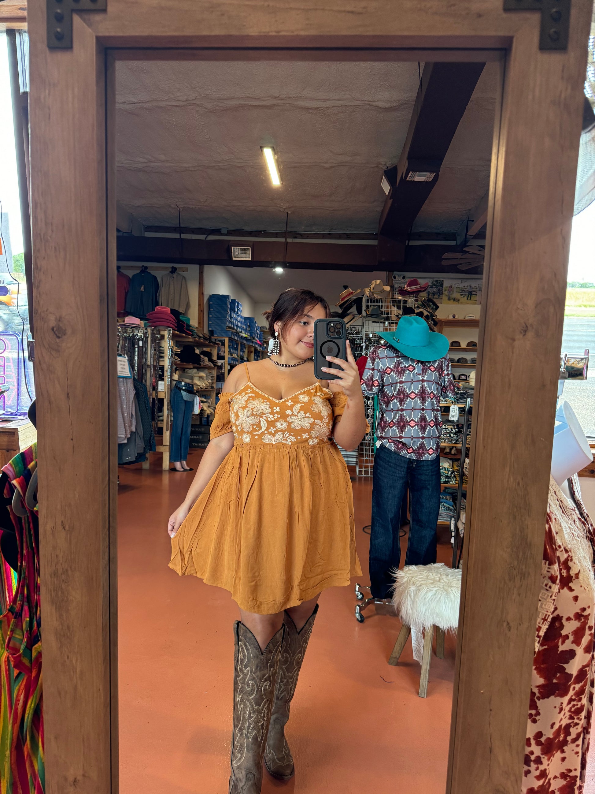 Introducing the Savanna Jane Marigold Dress, in a stunning muted mustard yellow color. The off the shoulder sleeves add a touch of elegance, while the white floral embroidery adds a feminine and delicate touch. Elevate your style with this beautiful and versatile dress.