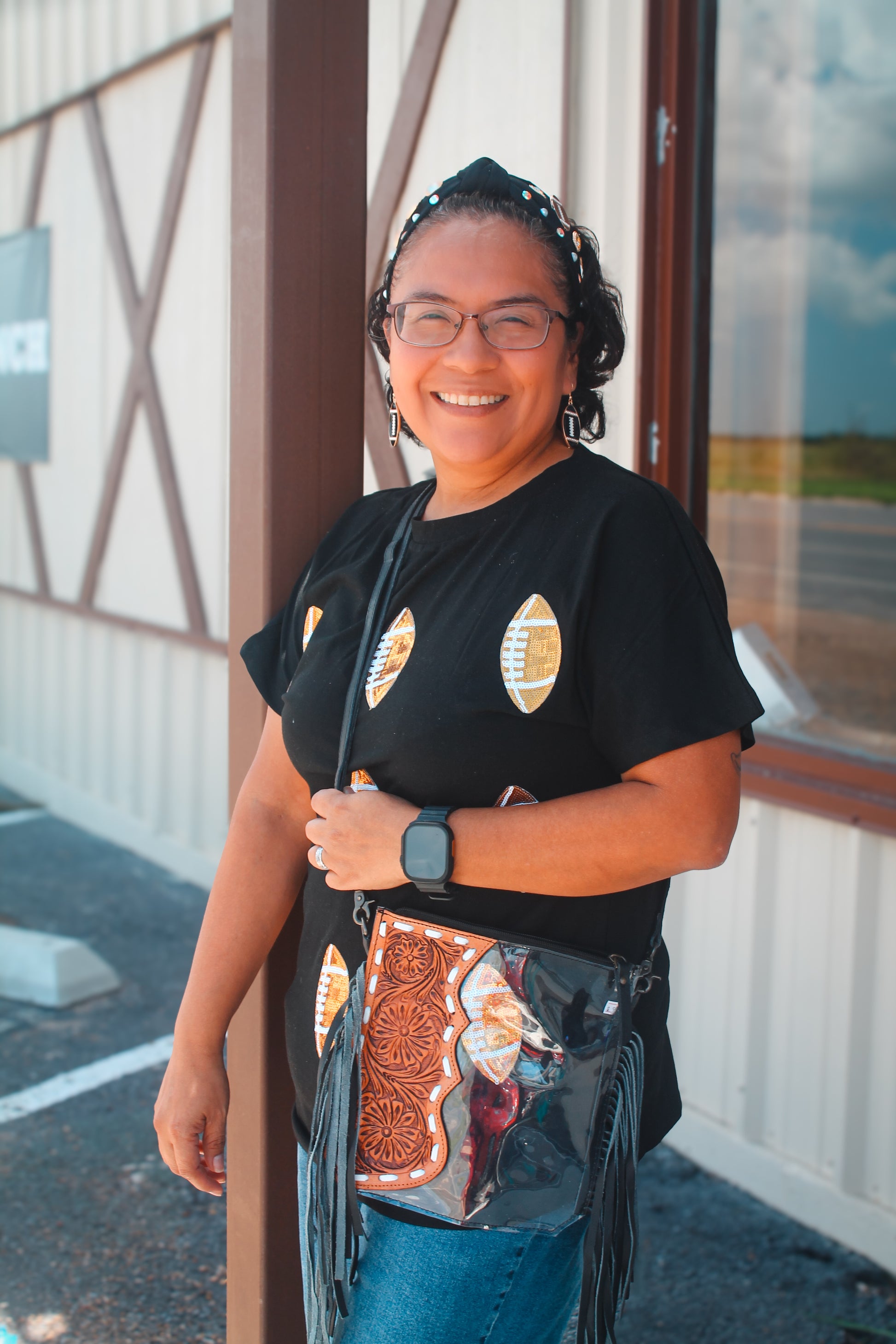 This black Sequin Football Top offers a stylish and sporty look with its half sleeve design. Made with high-quality material, it provides comfort and durability. Perfect for a casual day out or a game with friends.