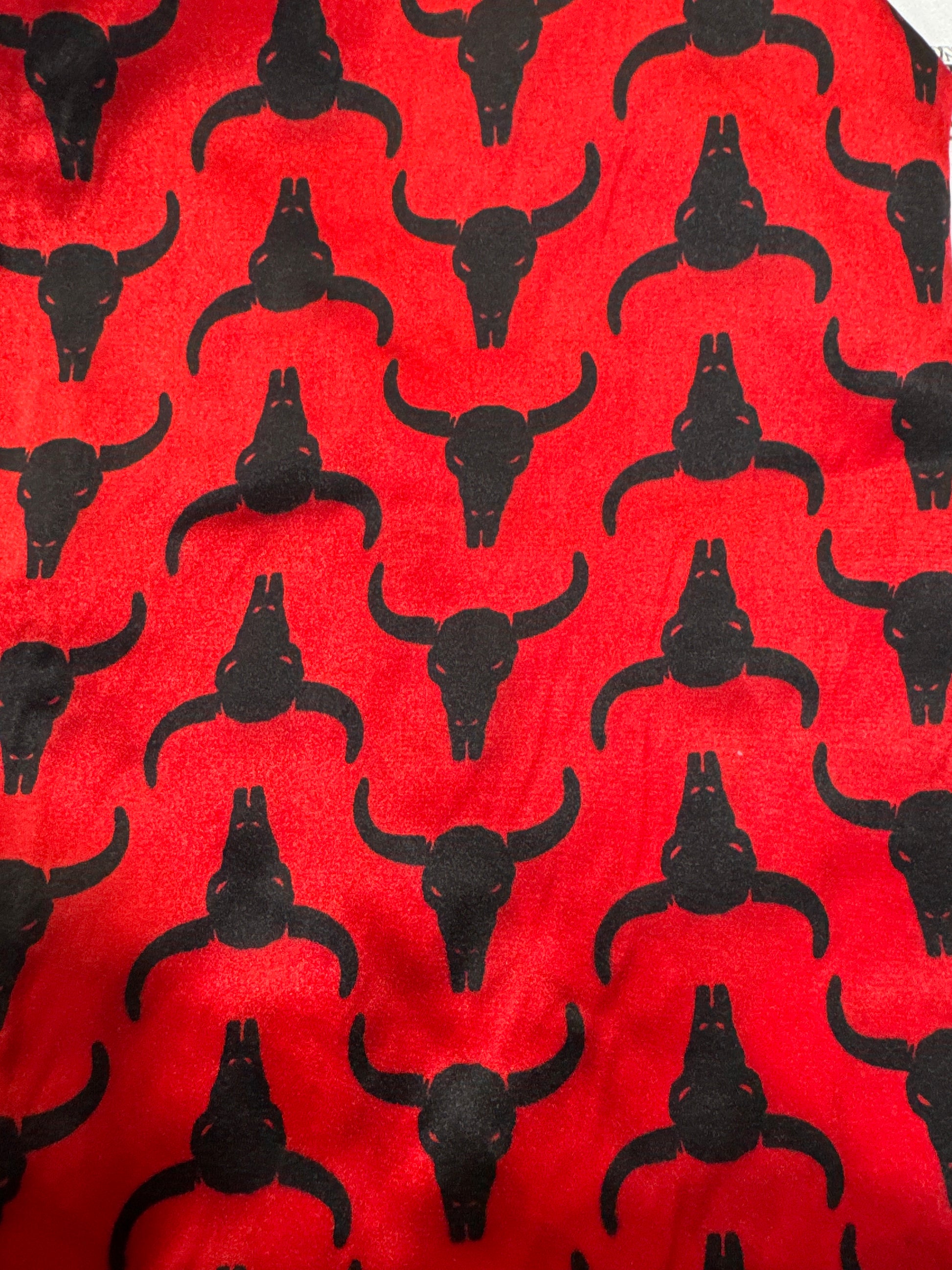 Expertly crafted from premium red silk, the Skull Wildrag features a striking design of cow skulls. With its luxurious fabric and unique print, this wildrag adds a touch of rugged elegance to any outfit. Perfect for adding a touch of personality and style to your wardrobe.