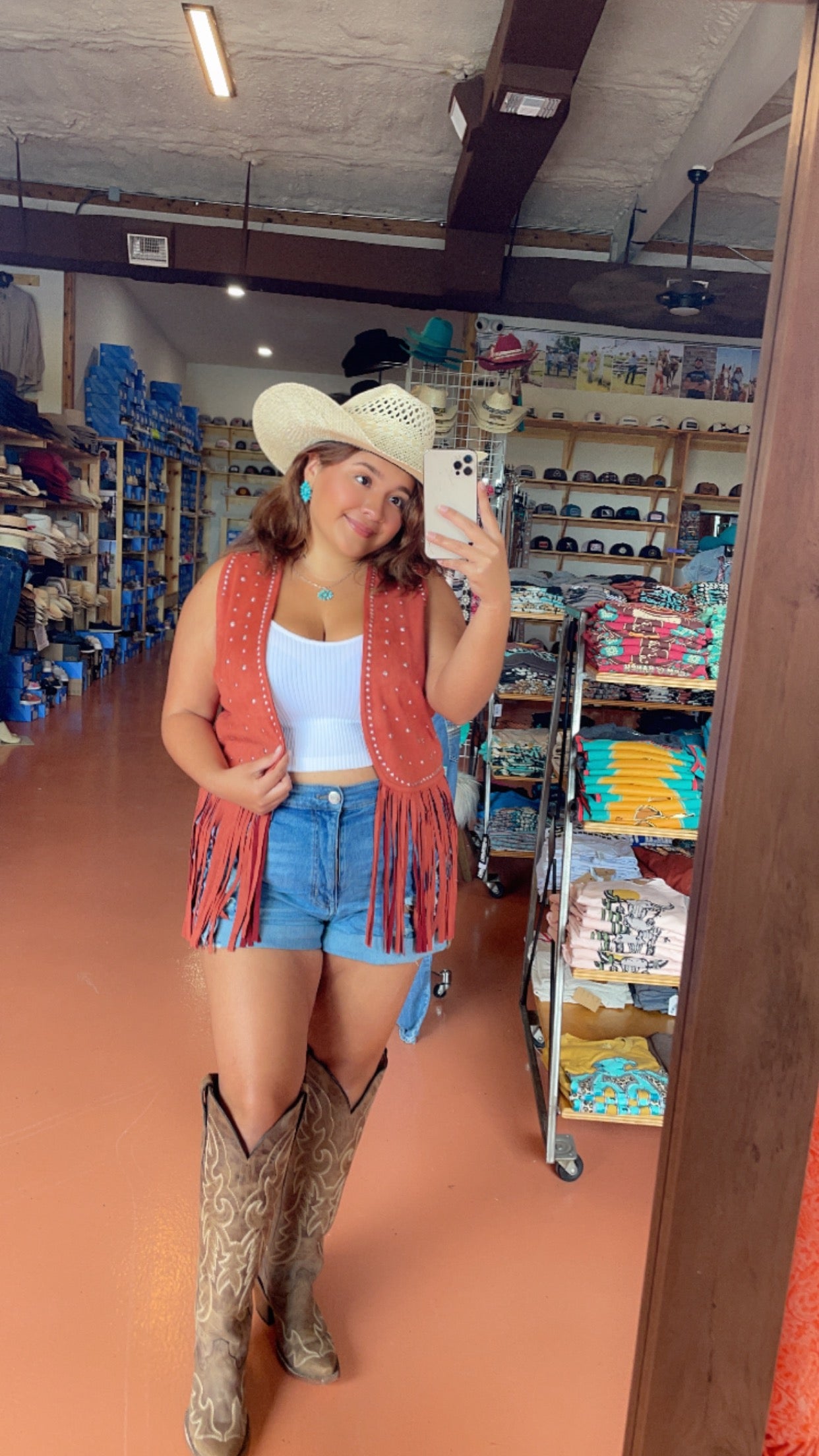 Fall in love with our Studded Fringe Vest! Its gorgeously rich rust color and stunning studded design will make you stand out wherever you go. And with the added touch of fringe at the bottom, you'll be turning heads and receiving compliments all day long. Elevate your wardrobe with this must-have piece.