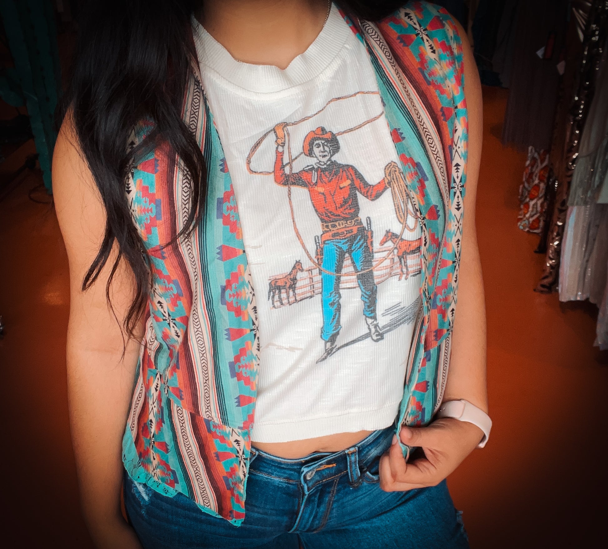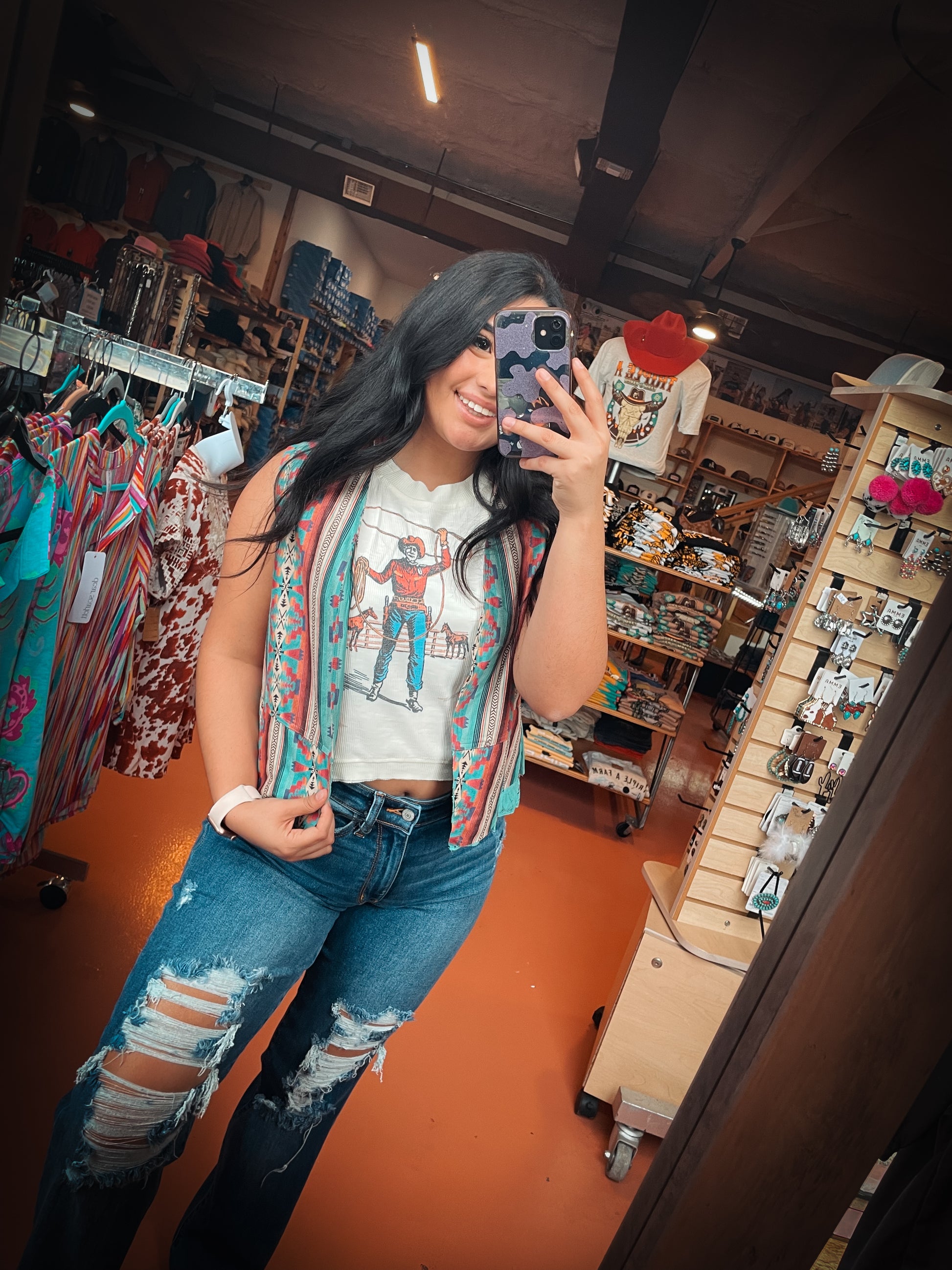 Unleash your inner fashionista with the Tammy Aztec Vest! Featuring a stunning serape and aztec design, this vest adds a pop of color to any outfit. The turquoise lace hem adds a touch of elegance, making it the perfect addition to your wardrobe. Stand out from the crowd and elevate your style game with this must-have piece!