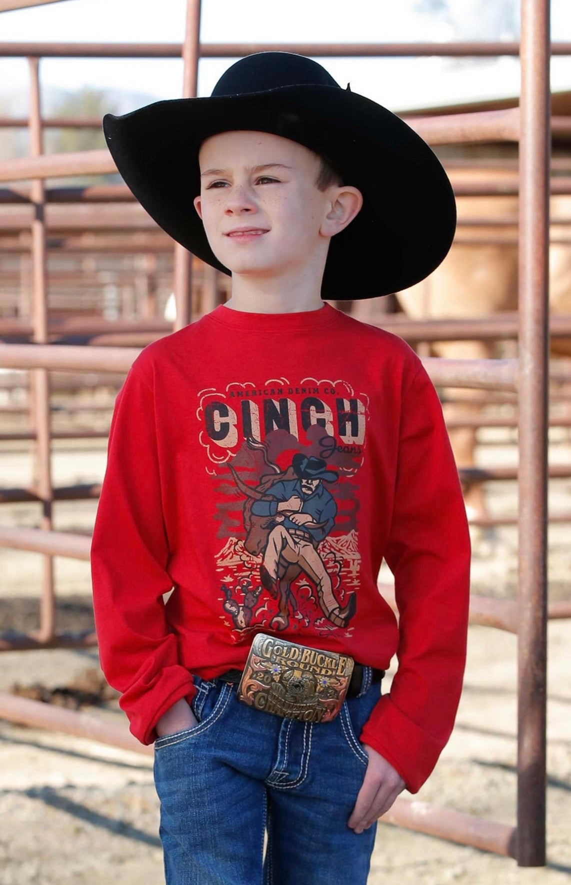 Rope him into the ranching way of life with our red crew neck tee shirt that features a front screen print any budding cowboy will love. Constructed in comfortable cotton-poly material, this long-sleeved tee makes the perfect partner for new blue jeans and cowboy boots.