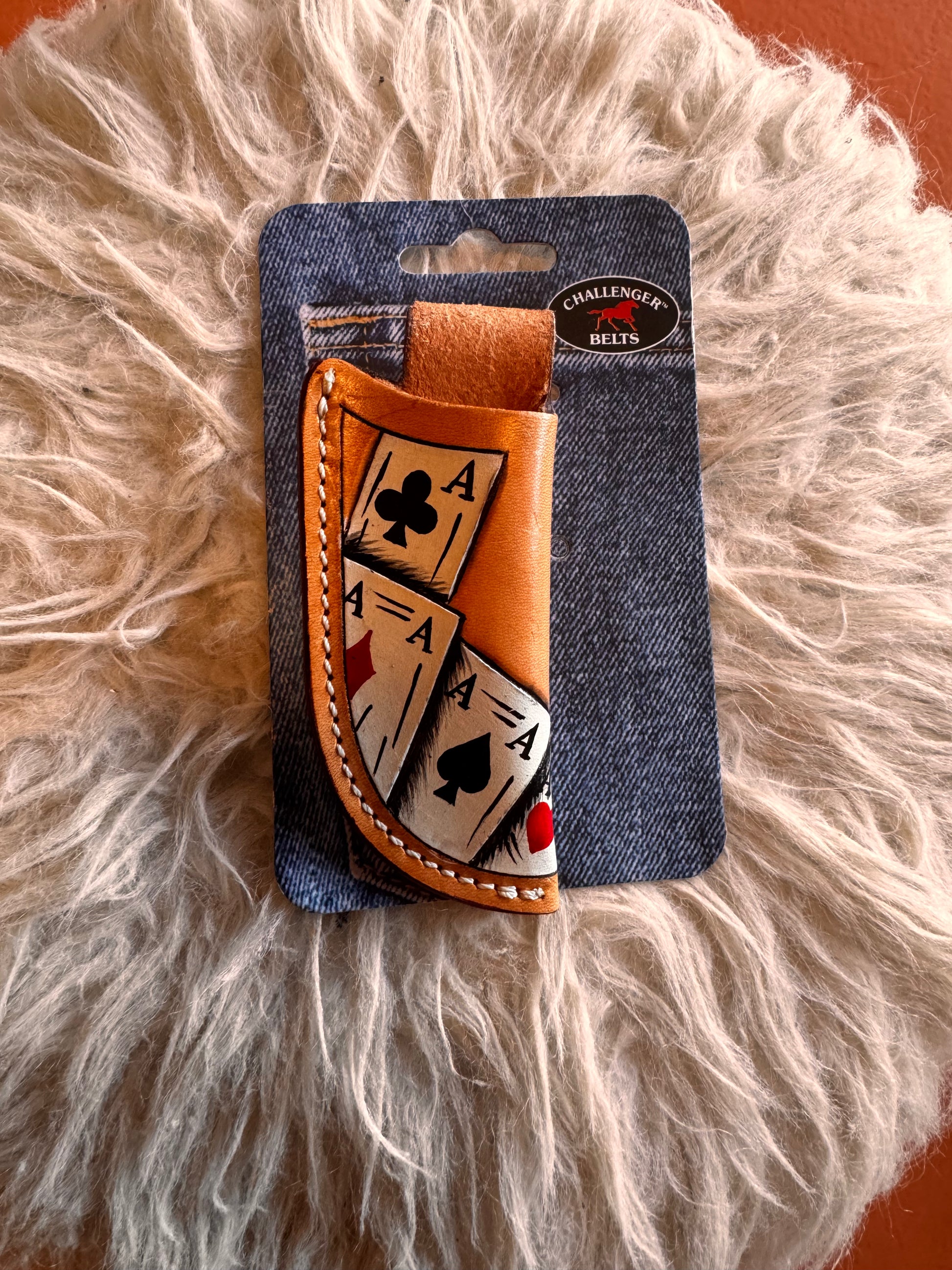 This light leather color knife holder is designed for easy carrying and stylish storage. The holster features a convenient belt loop and is adorned with a fun poker card design. Keep your knife close and your style sharp with the Western Poker card knife Sheath w/ Belt Loop.