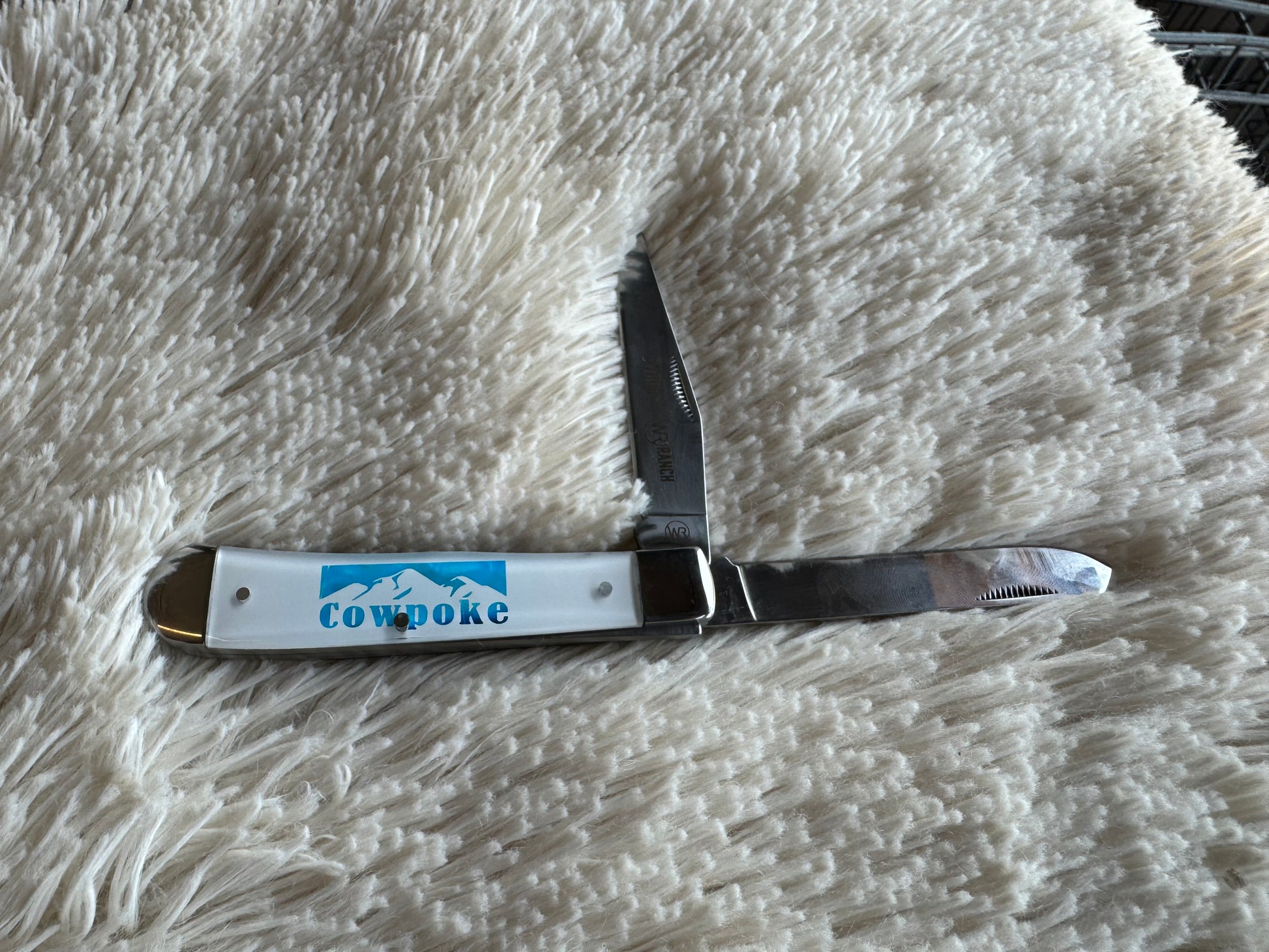 This Whiskey Bent Cowpoke Trapper Knife is a must-have for any outdoor enthusiast. The white base, adorned with a turquoise mountain and "cowpoke" inscription, adds a touch of western charm. Handy for any task, this knife is as rugged and reliable as it looks.