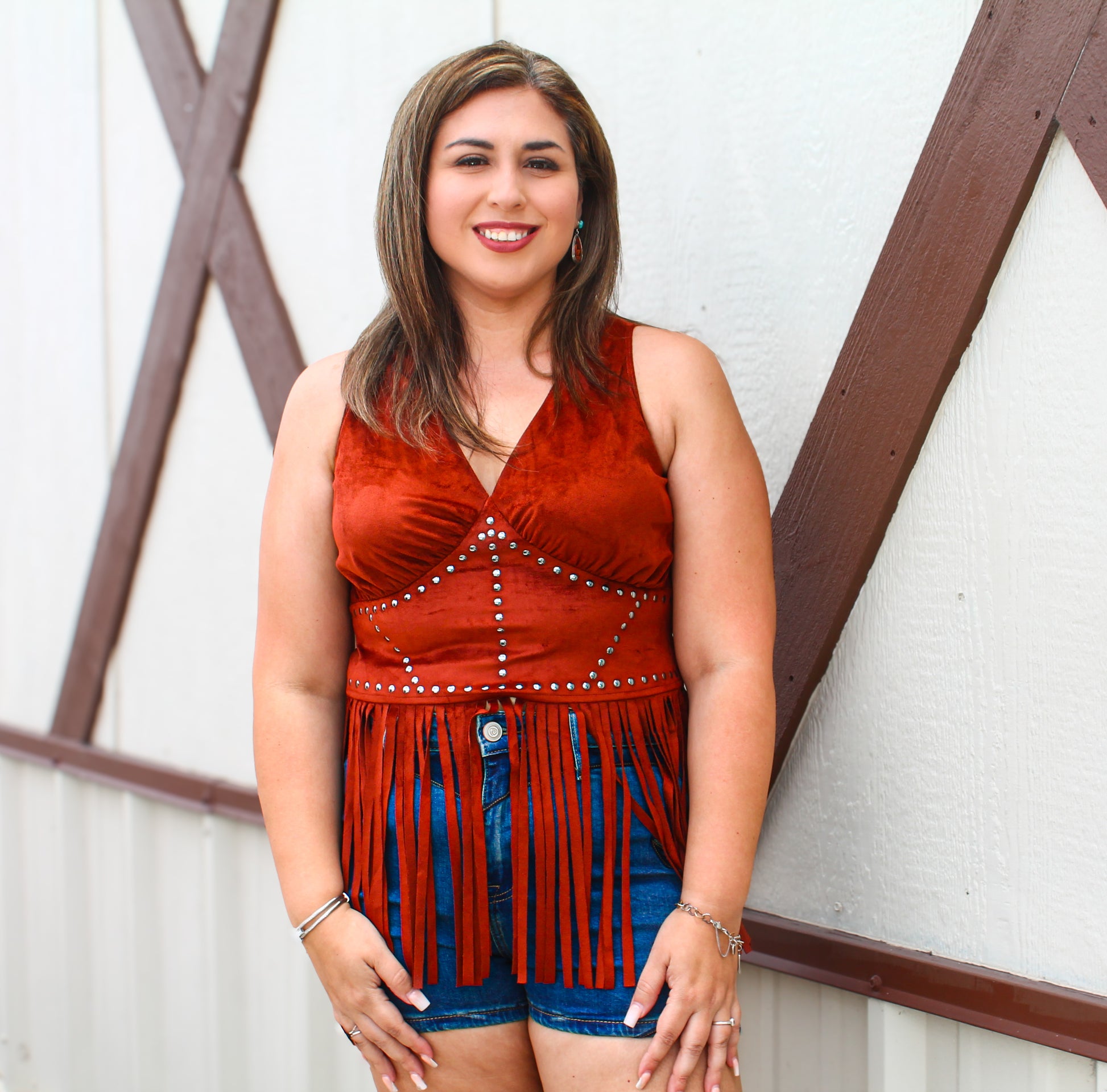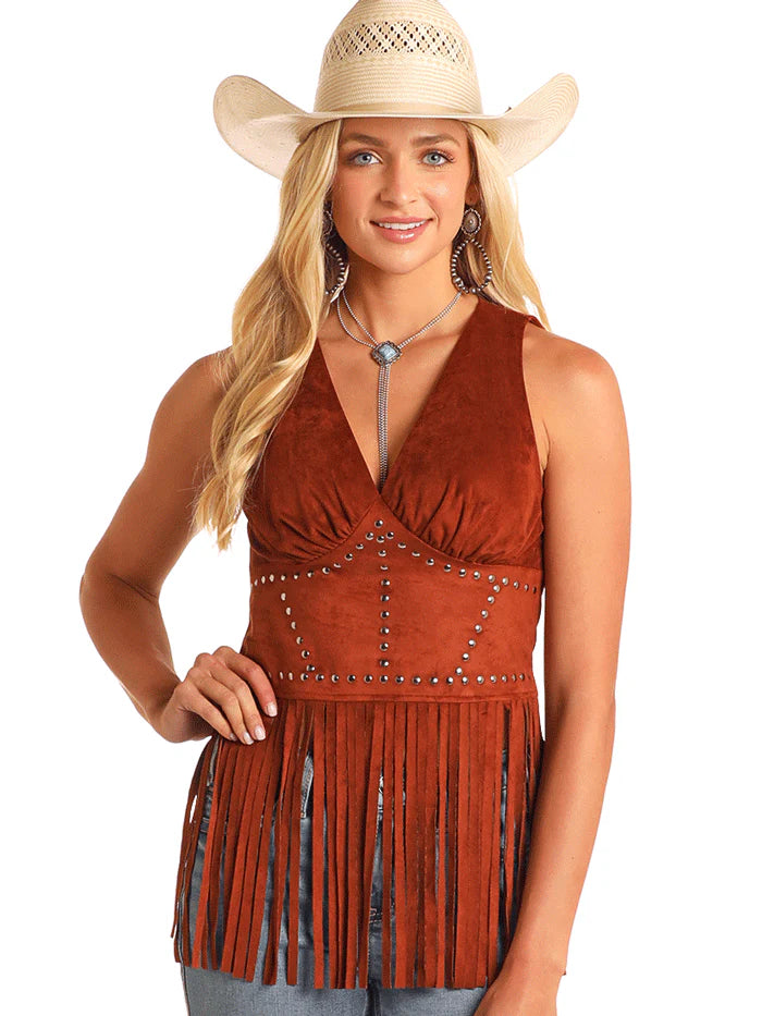Elevate your style with our Women’s R&R Brown Studded Fringe Top. Made with a comfortable blend of 60% cotton and 40% polyester, this top features a V neckline, sleeveless design, and a cropped silhouette for a trendy look. The solid brown color is accentuated by studded details on the bodice and a fringe hem, adding a touch of edginess to any outfit.