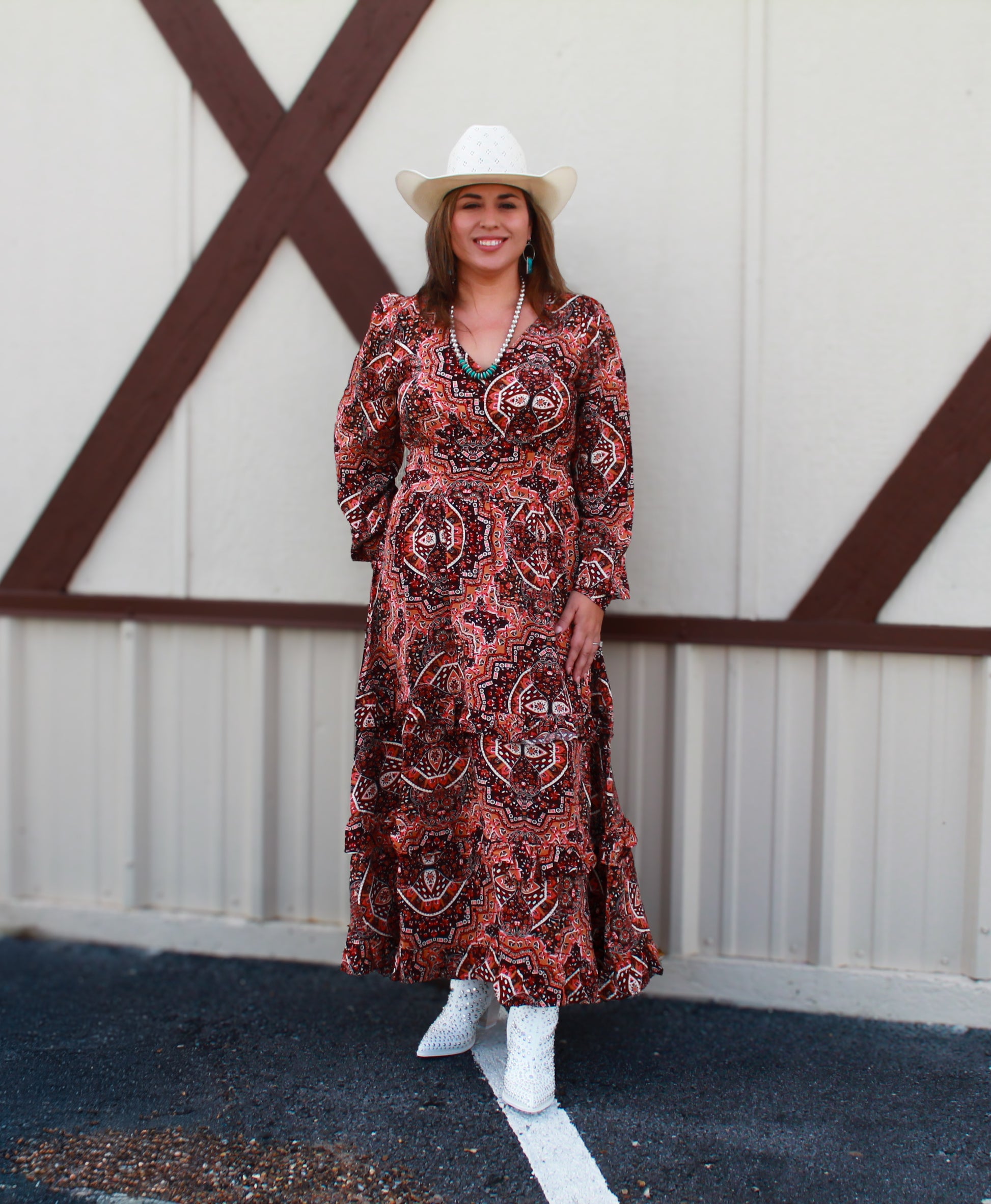 Expertly show off your style in our Women's Ruffle Accent Maxi Dress. Made with a flowy, lightweight fabric, this dress can be worn all year round. The eye-catching mosaic print in brown and peach tones adds a touch of elegance. Featuring a sweet V-neck silhouette, billowy sleeves, and a tiered skirt with ruffle accents, this dress is perfect for any occasion. Complete your look with cowgirl boots for a perfect ensemble.