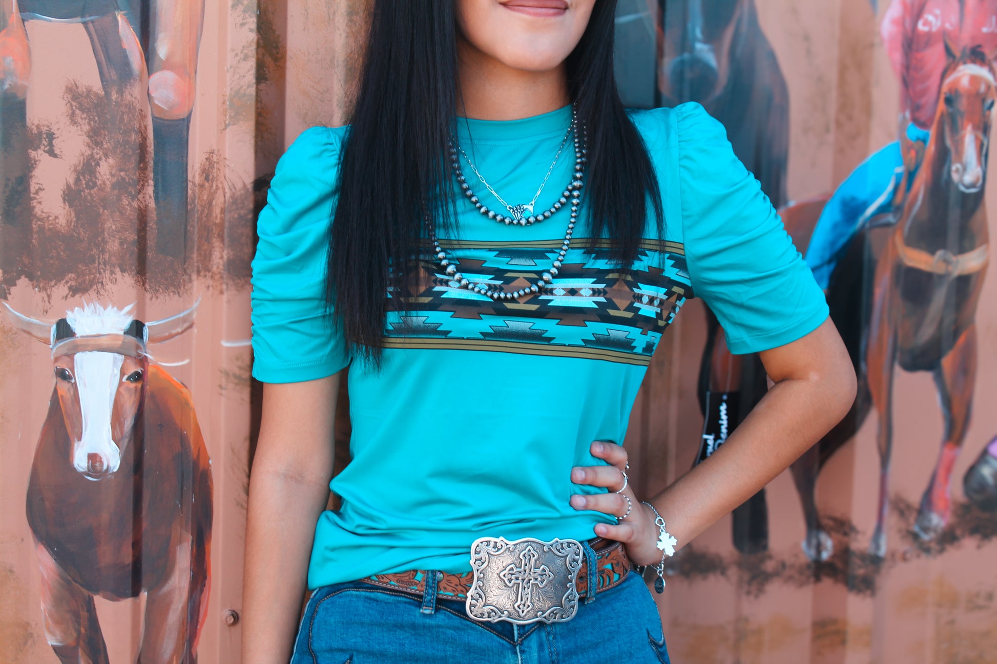 Expertly crafted in a vibrant teal color with a striking Aztec design, this women's tee is made from high-quality polyester material. Lightweight and durable, it offers superior comfort and style for any occasion. Perfect for adding a pop of color to your wardrobe, this tee is a must-have for any fashion-forward woman.